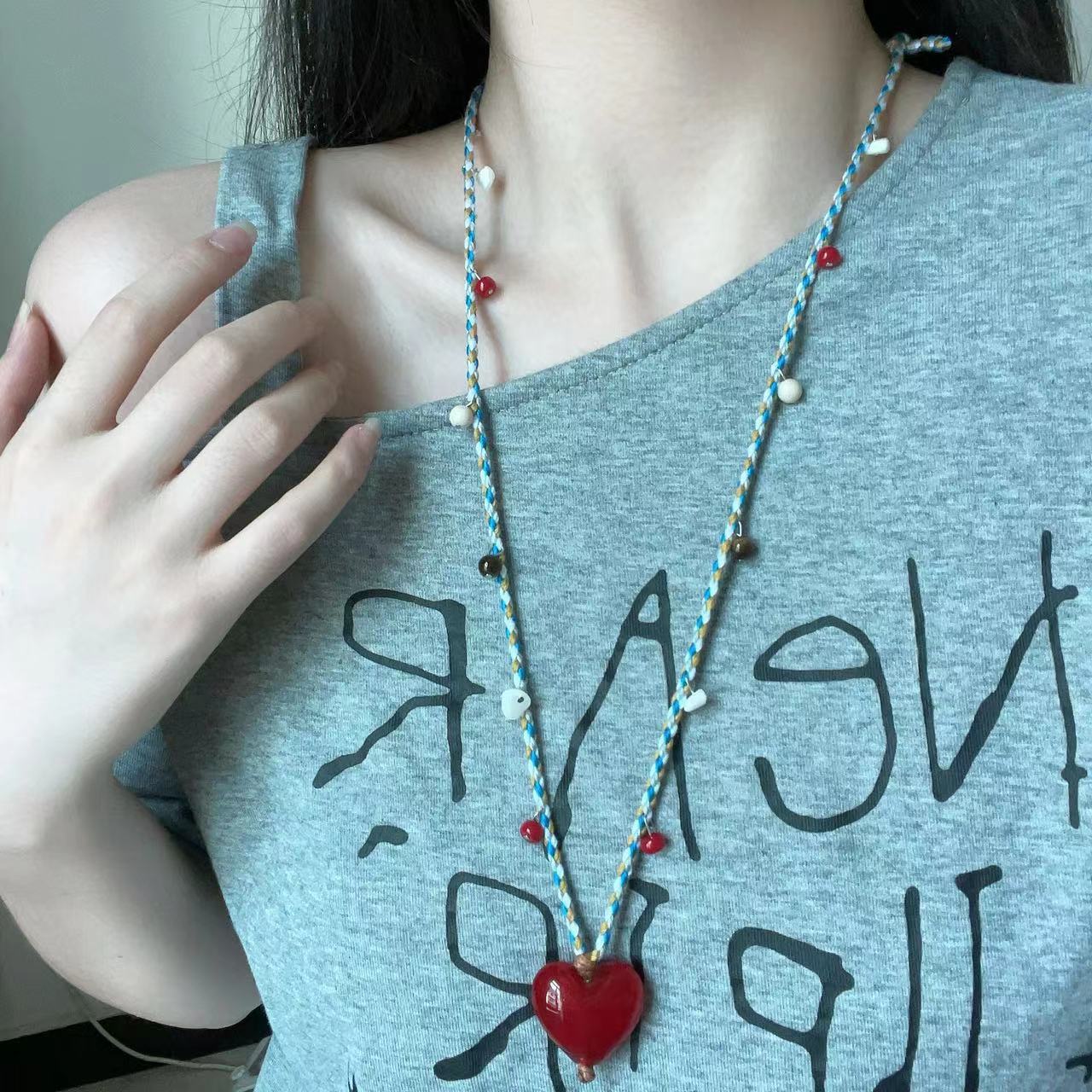 新中式红色爱心吊坠编织绳项链时尚休闲潮流简约ins风毛衣链新款