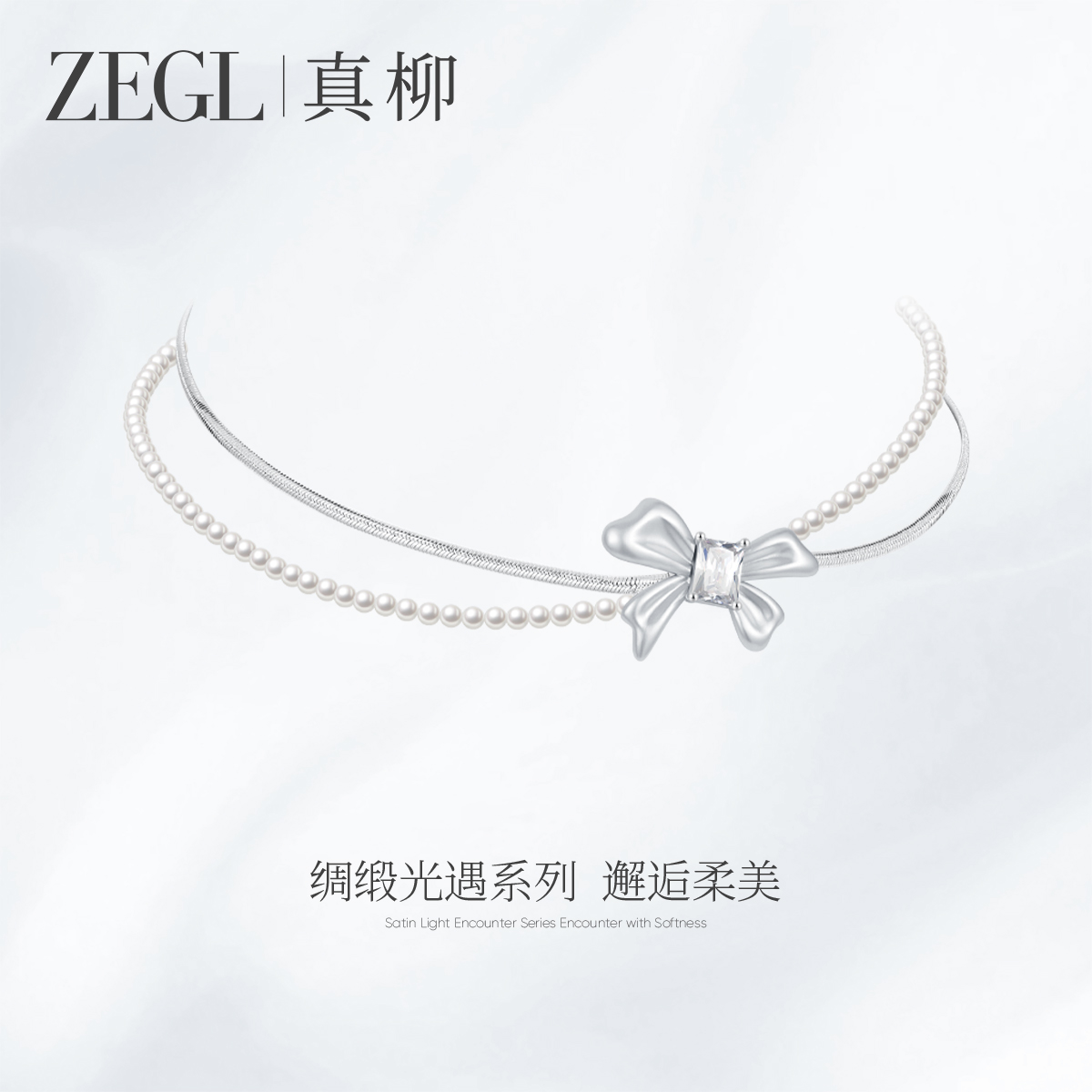 ZEGL设计师绸缎光遇系列珍珠银链双层项链女款2025新款蝴蝶结颈链