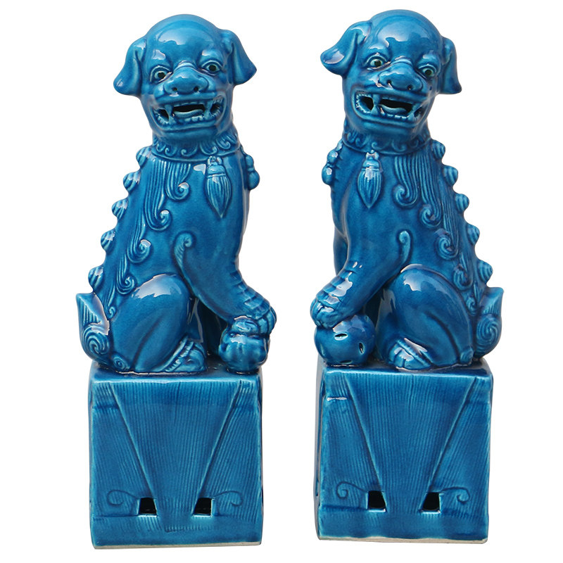 景德镇陶瓷对狮狮子狗雕塑蓝色孔雀蓝陈设摆设家用家居雕刻一对