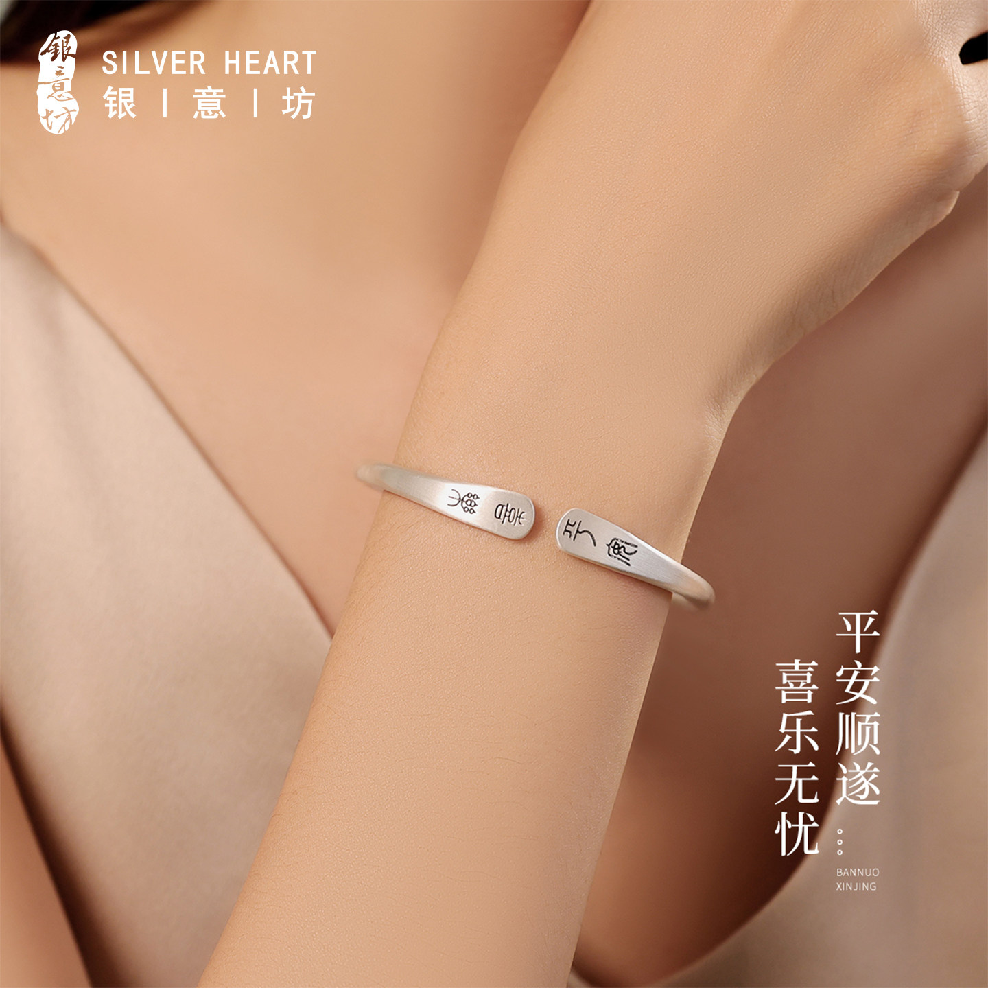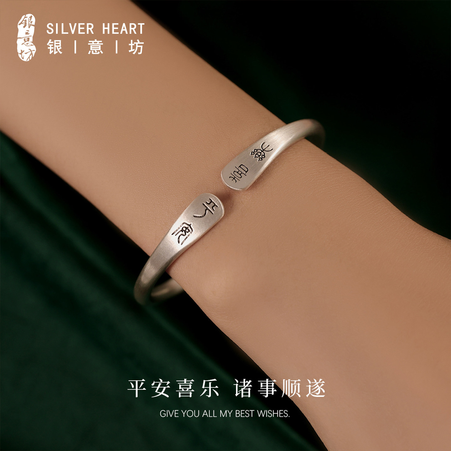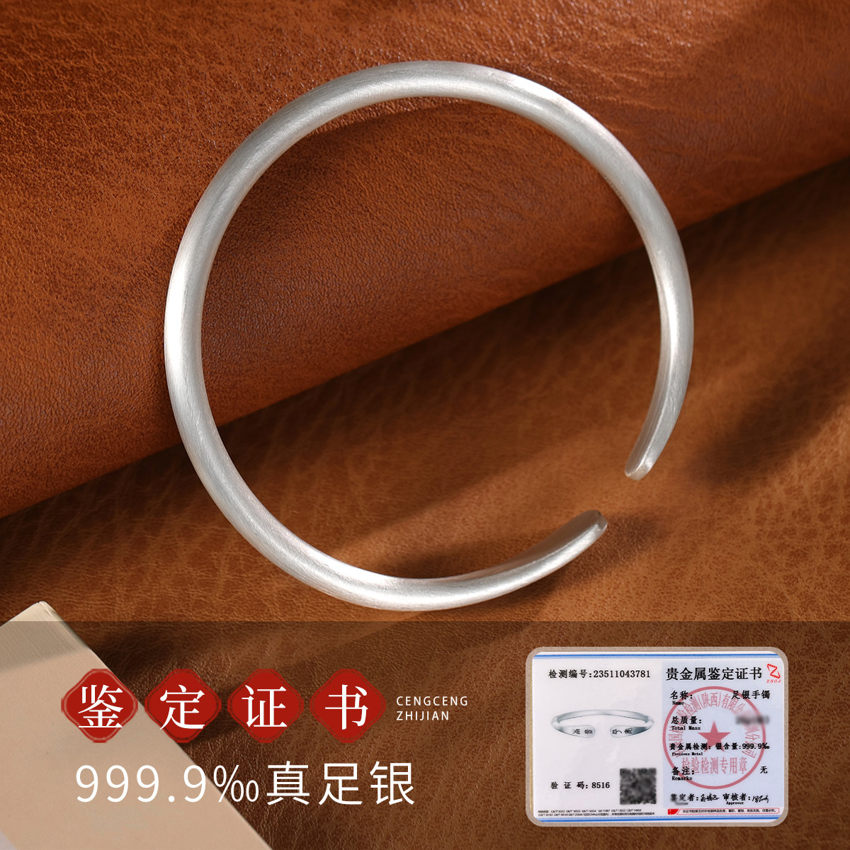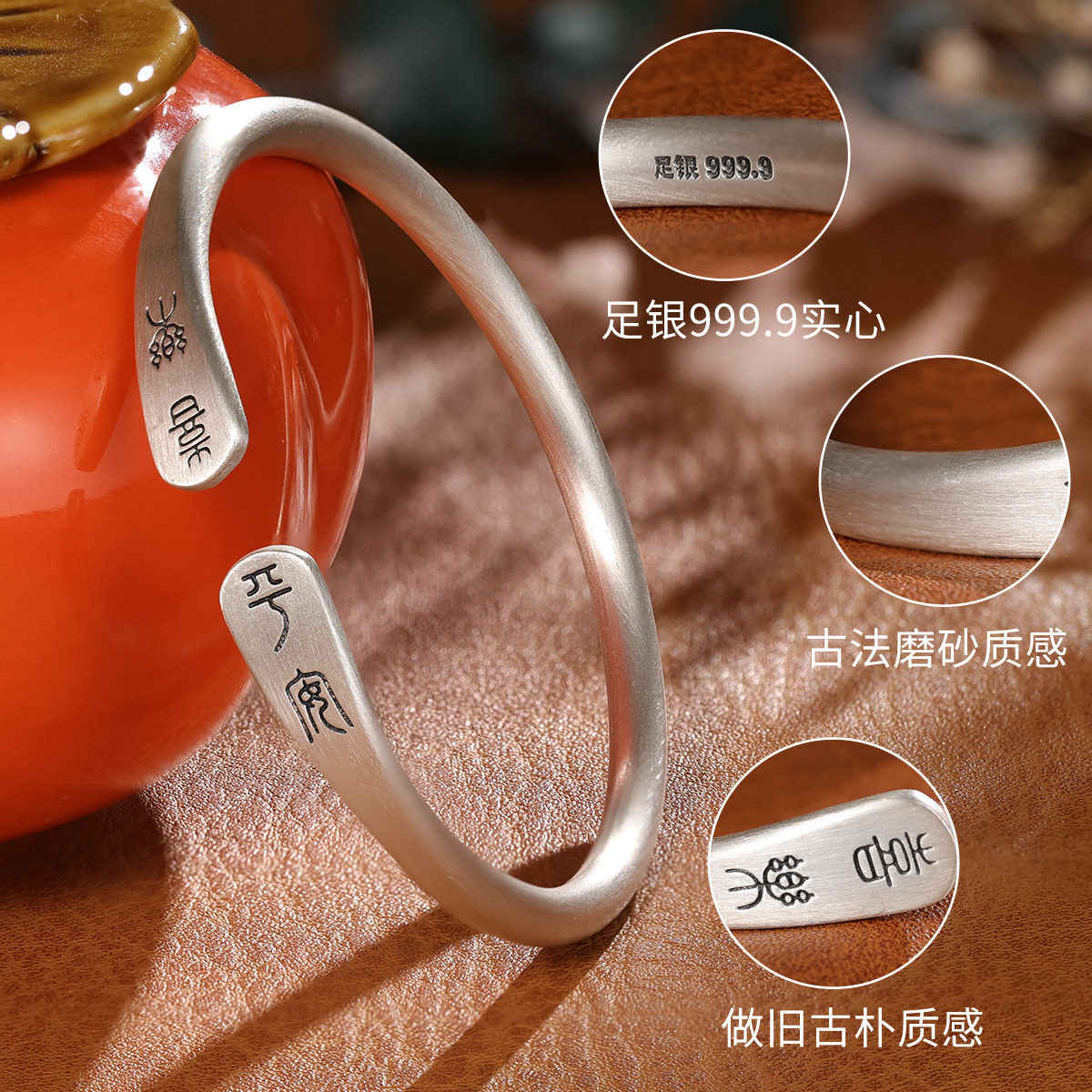 9999古法银手镯女款2026新款平安喜乐足银镯子开口素圈复古实心款