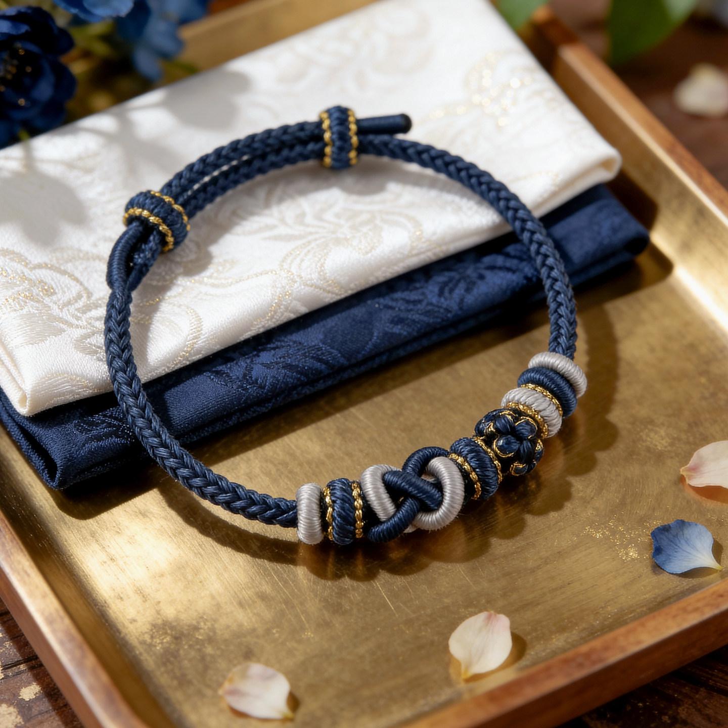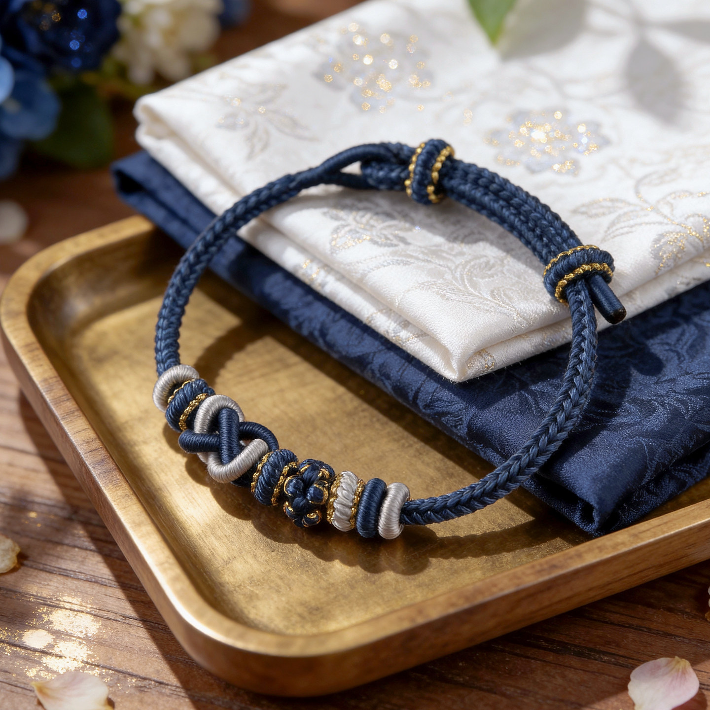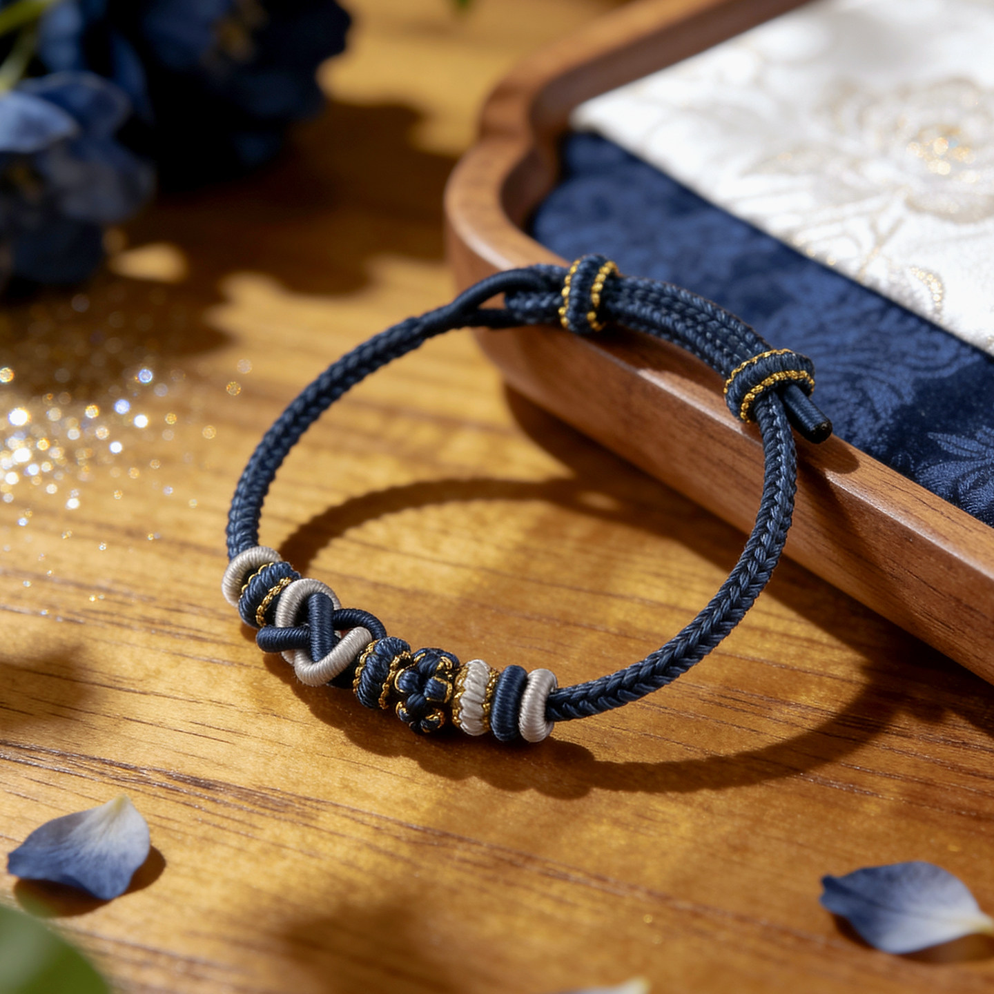 纯手工编织绳平安结蓝色手绳可穿珠可串黄金转运珠可调节编绳手链