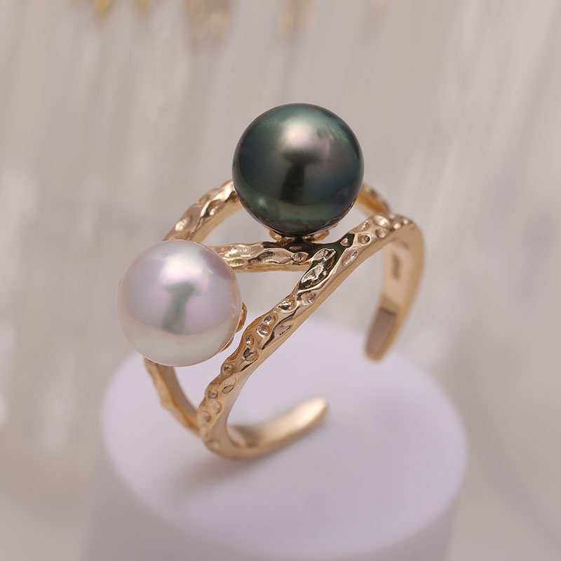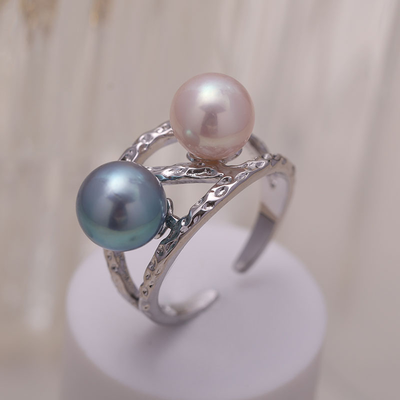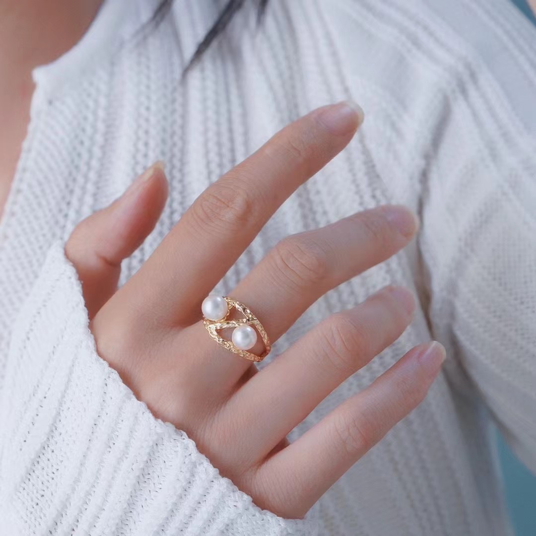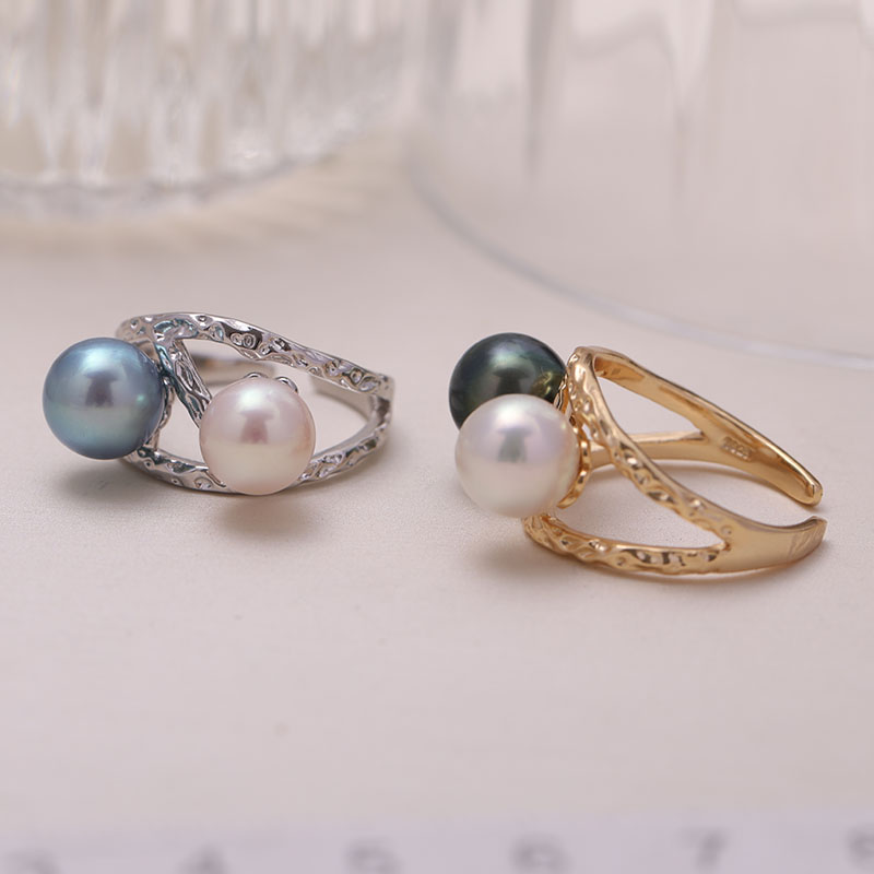 DIY珍珠配件S925纯银时尚几何纹理双珠戒指托指环戒托空托配饰品
