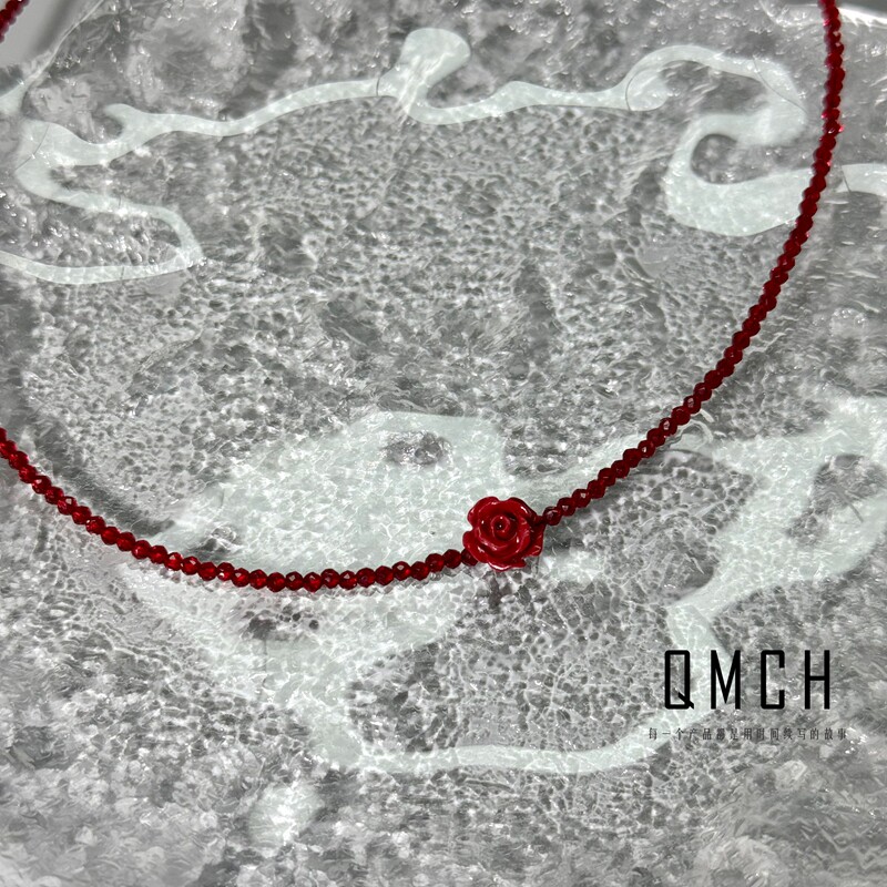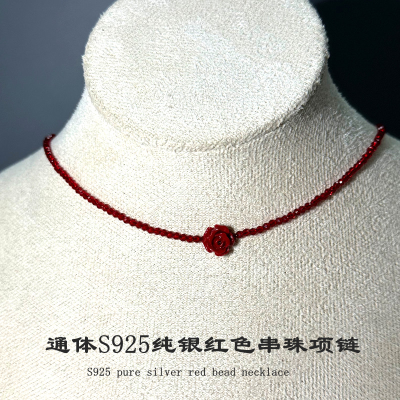 S925纯银红色尖晶石山茶花串珠项链女锁骨链颈链小众设计气质日韩