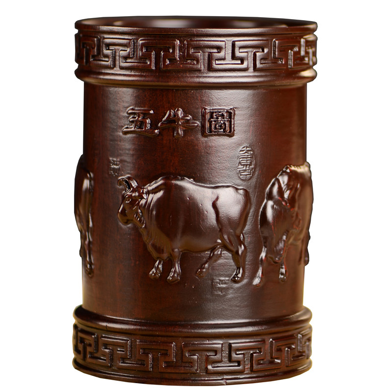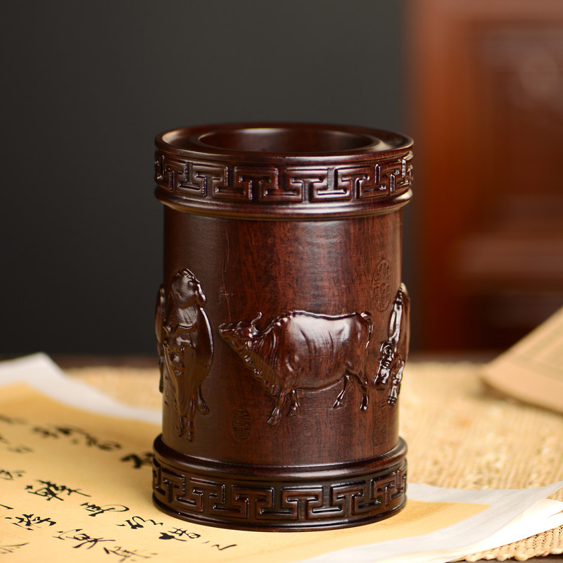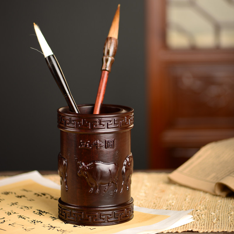 黑檀木雕五牛笔筒工艺品办公室书桌家居客厅木质中式笔筒摆件送礼