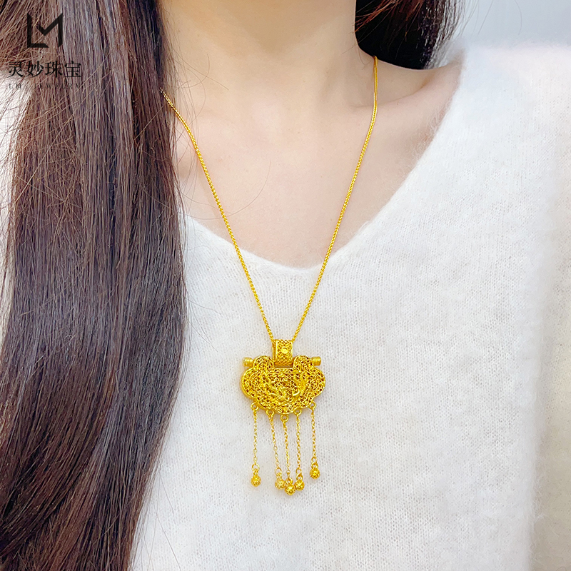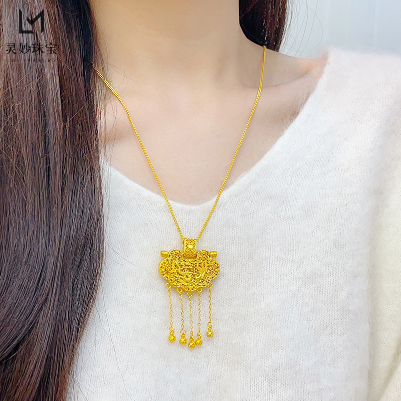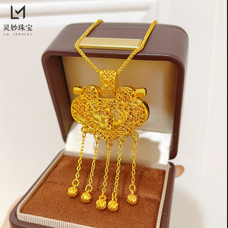 金店同款沙金古法天子门生龙凤平安锁包流苏吊坠项链宫廷送女友礼