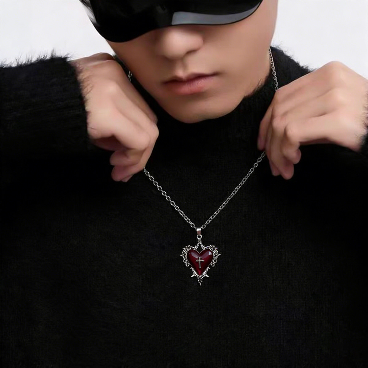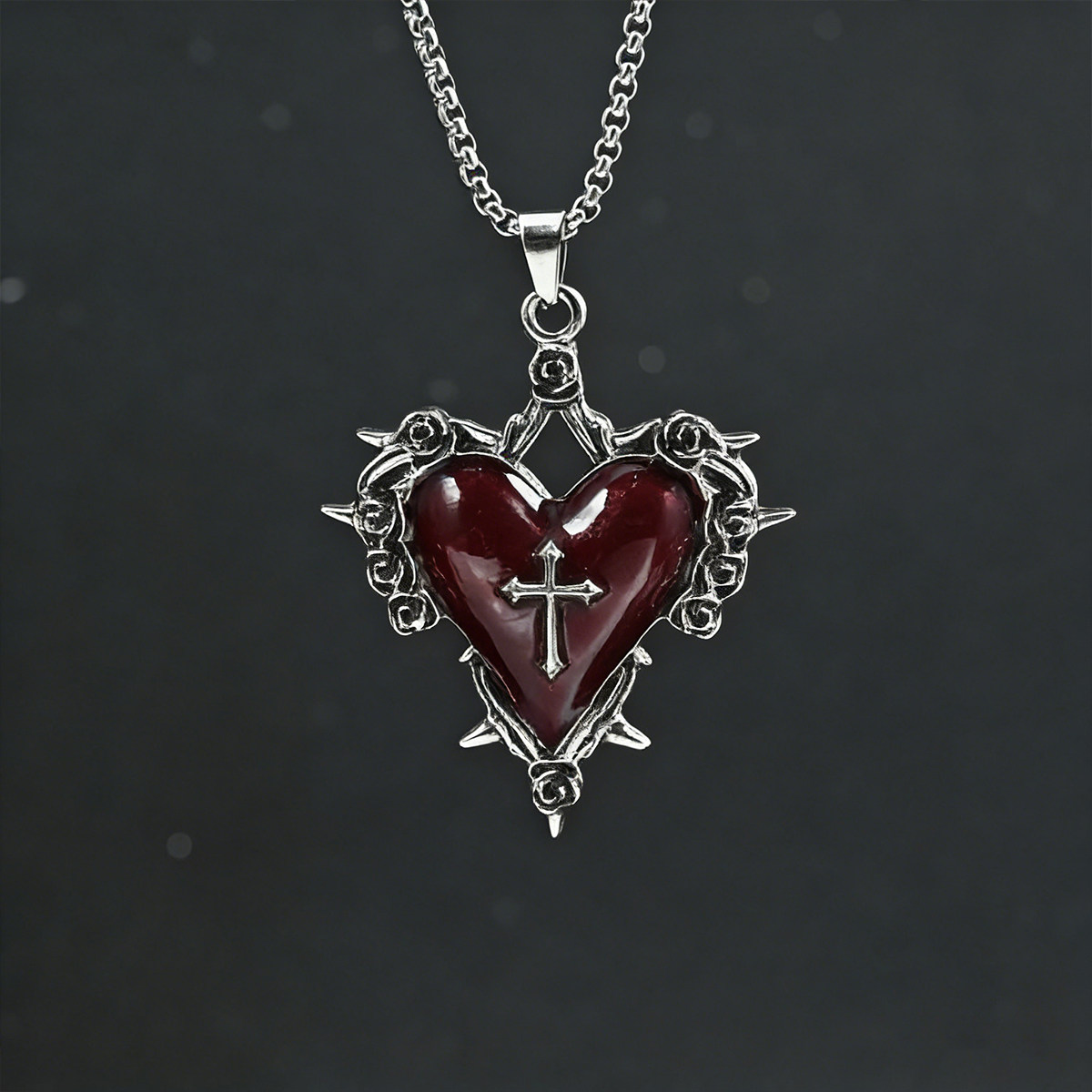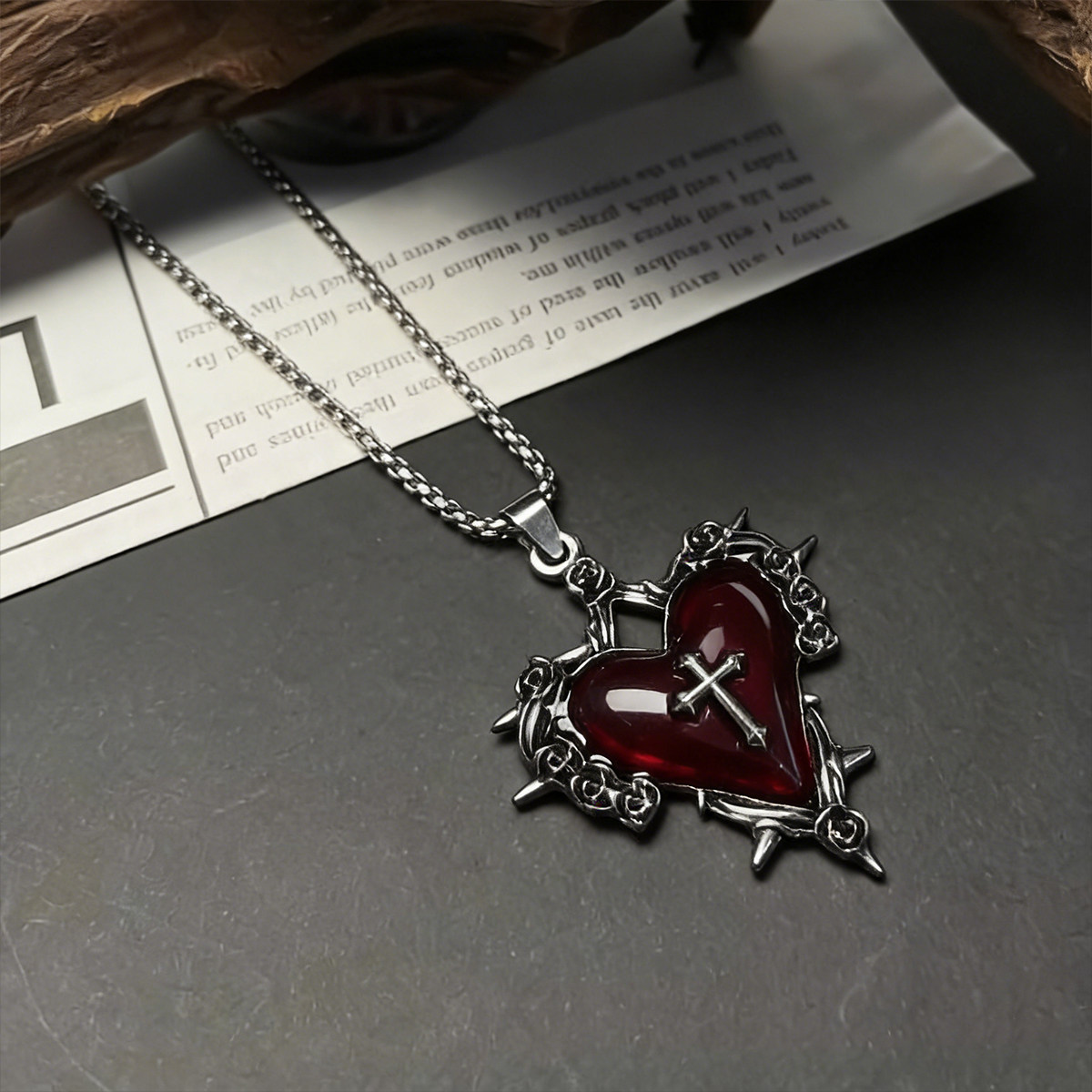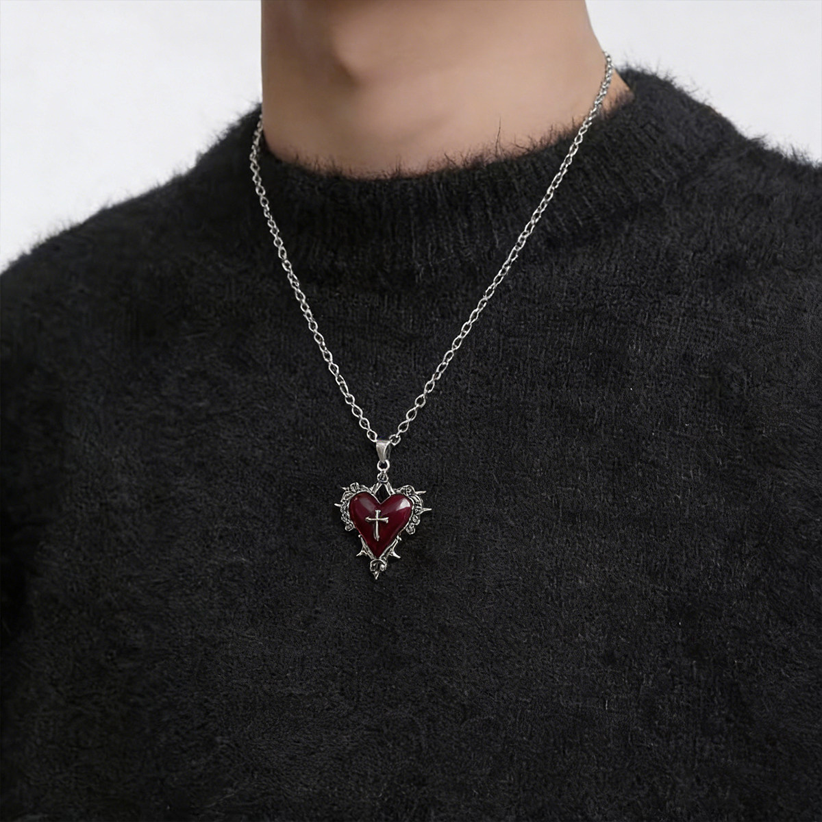 钛钢心形十字架项链男女通用复古个性吊坠古红色心焰十字架锁骨链