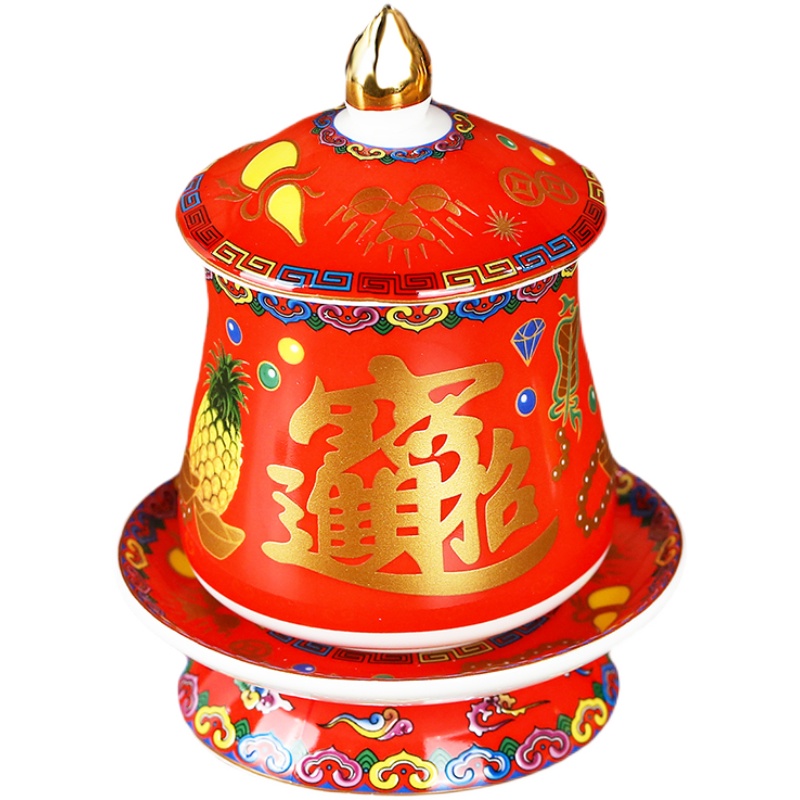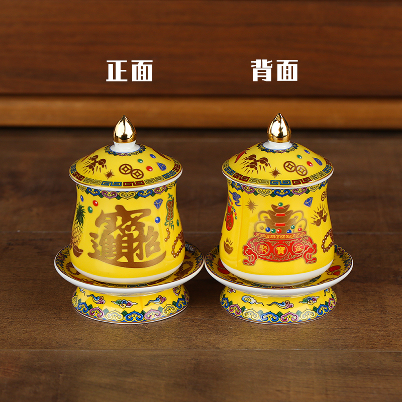 招财进宝供杯陶瓷供水杯文武财神关E公贡杯珐琅彩黄红色神台供茶