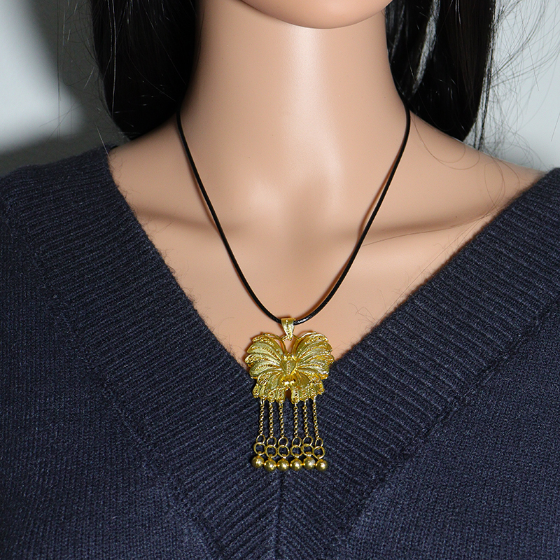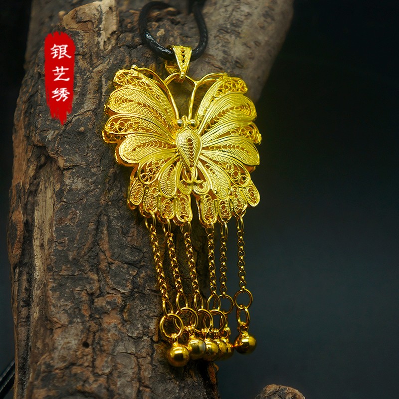 999纯银足银蝴蝶流苏吊坠 民族风拉丝项链毛衣链纯手工首饰礼品