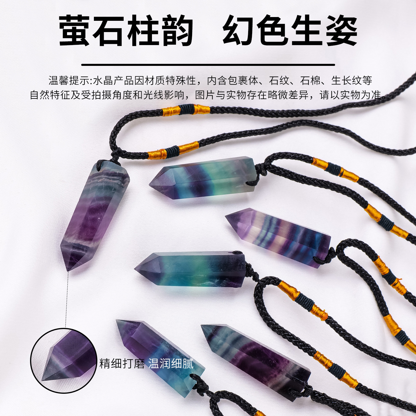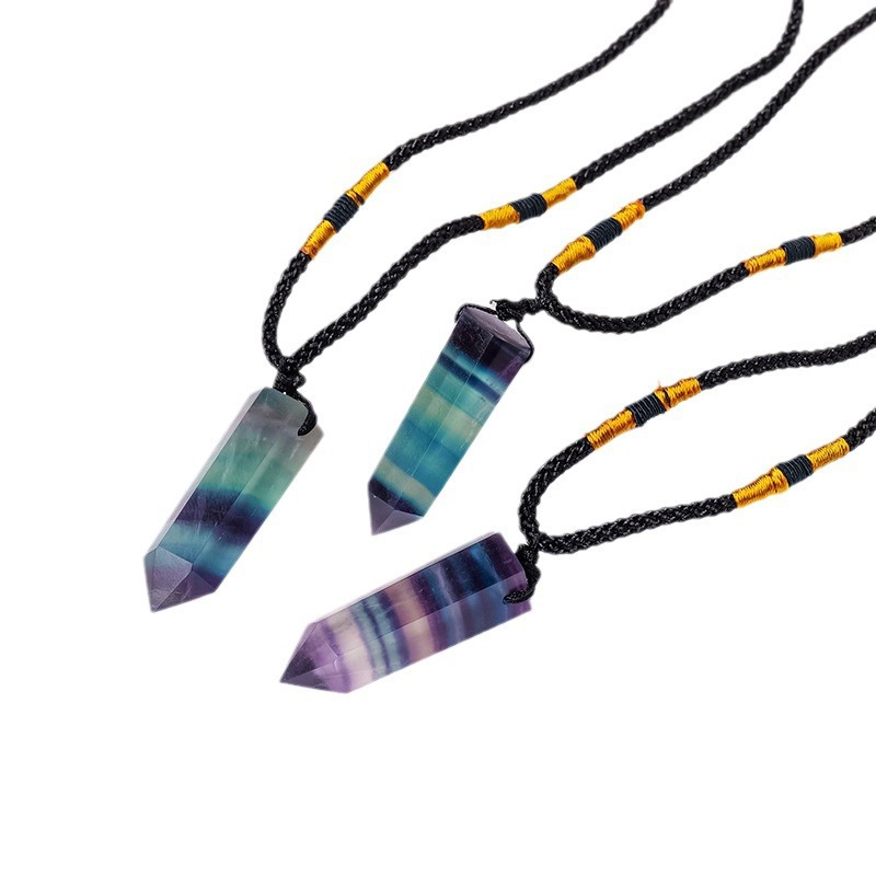 天然水晶七彩萤石单尖柱吊坠七彩萤石原石打磨单尖柱项链饰品挂件