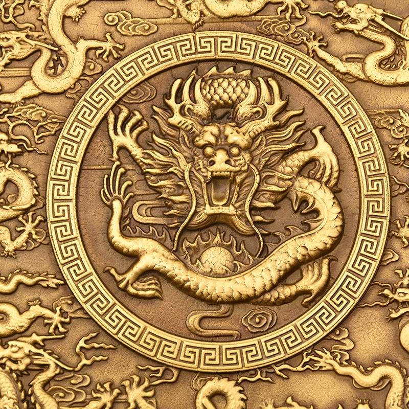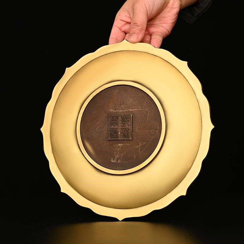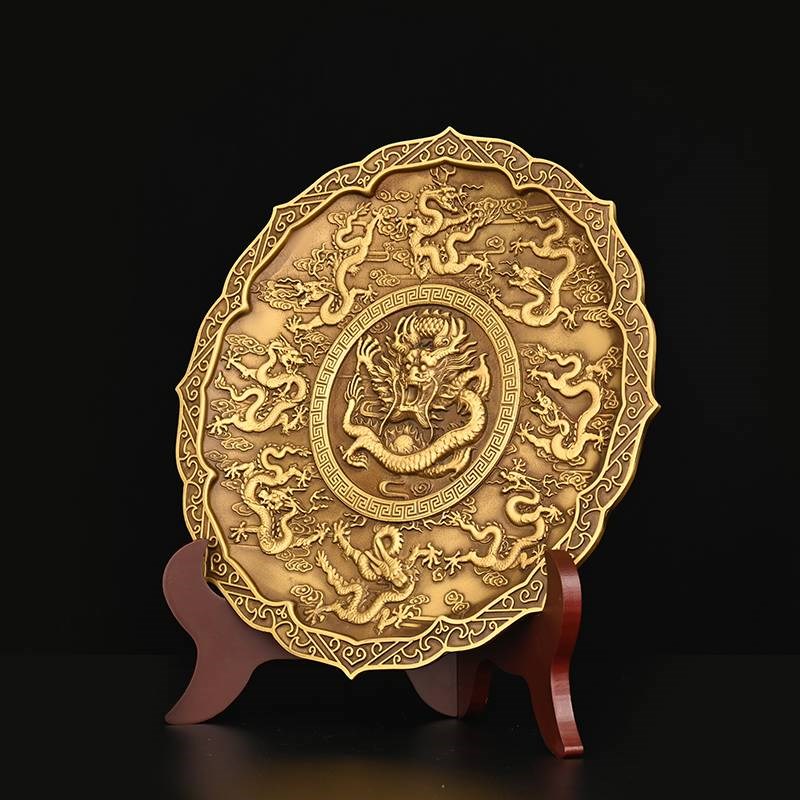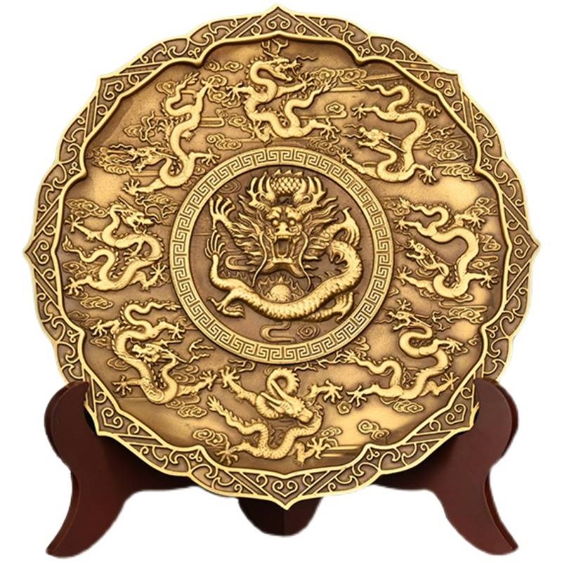 纯铜九龙盘子摆件九龙壁铜盘送支架客厅桌面装饰品仿古浮雕龙纹盘