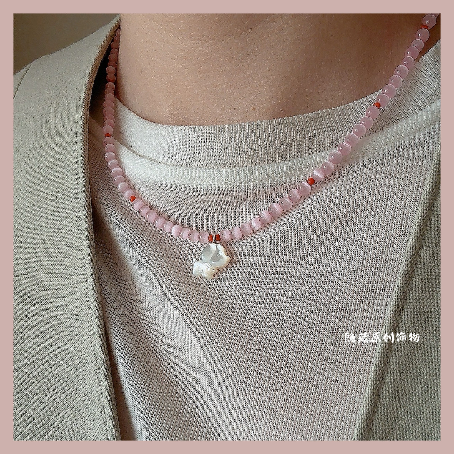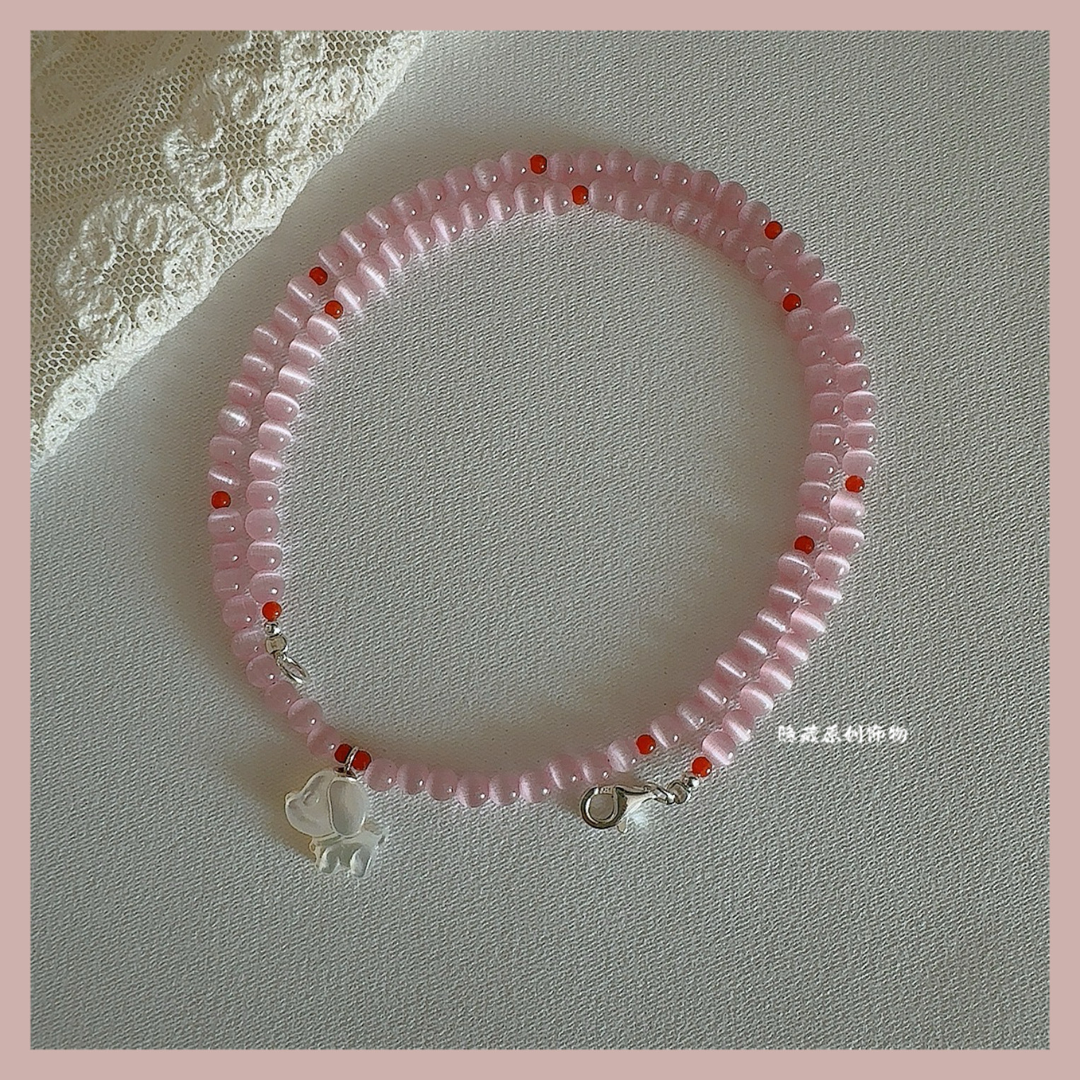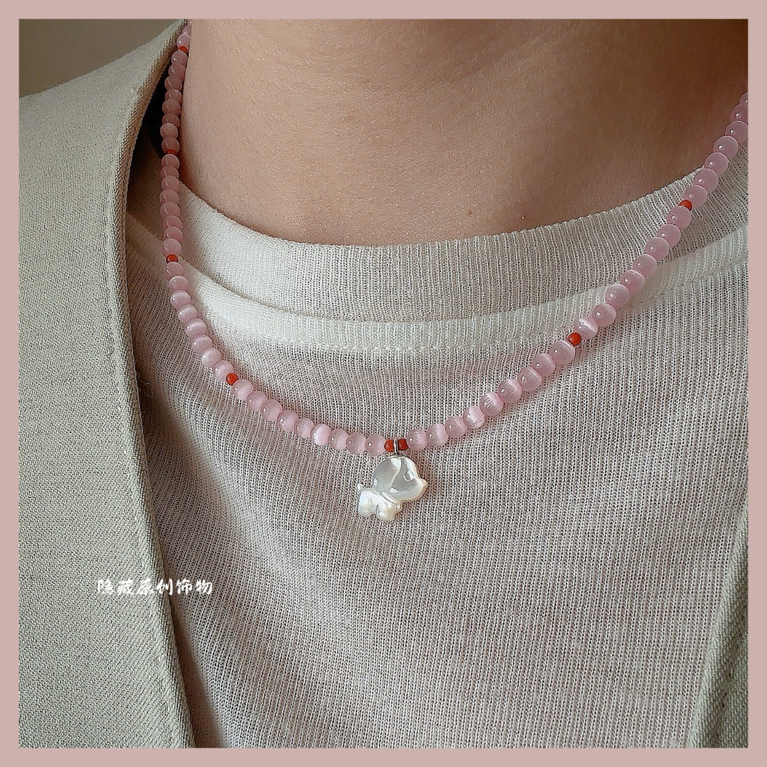 【少女的伙伴】原创粉猫眼石南红玛瑙白蝶贝狗狗串珠项链小众甜美