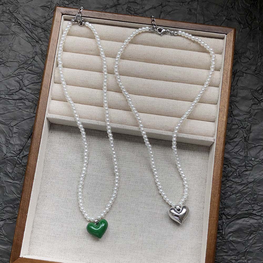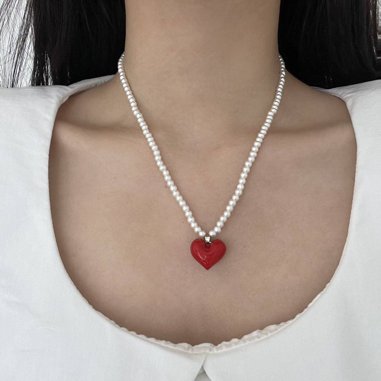 法式轻奢红色爱心珍珠项链女小众设计高级感复古百搭锁骨链毛衣链