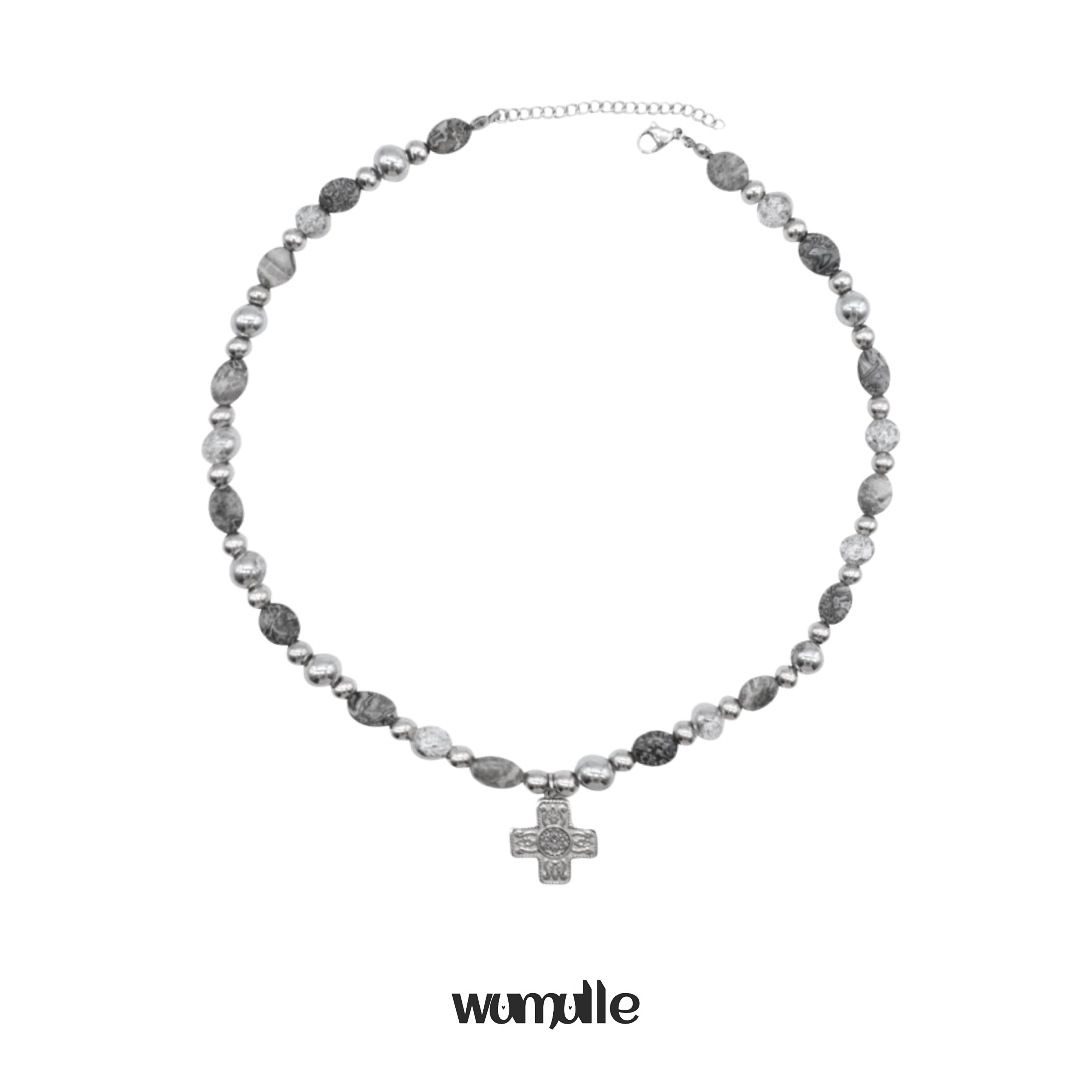 wumulle 原创中式拼接大理石灰色珠项链 叠搭十字架纹路复古质感