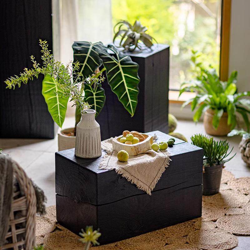 侘寂风实木方形黑色木墩仿古置物台花架软装展示台民宿装饰摆件