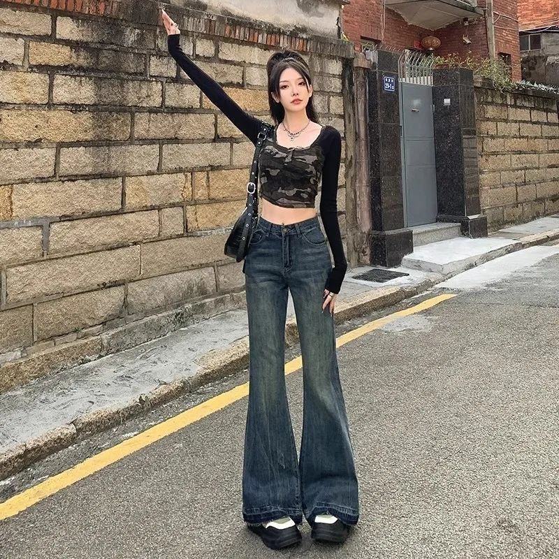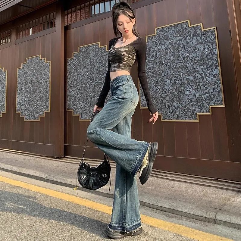 美式复古毛边微喇牛仔裤女秋冬2024年新款高腰显瘦宽松拖地喇叭裤