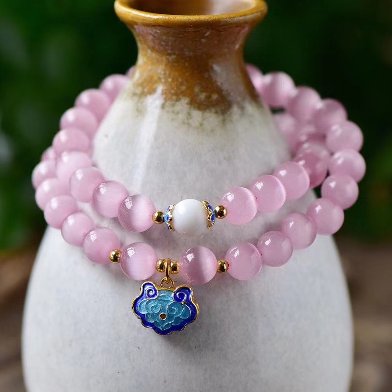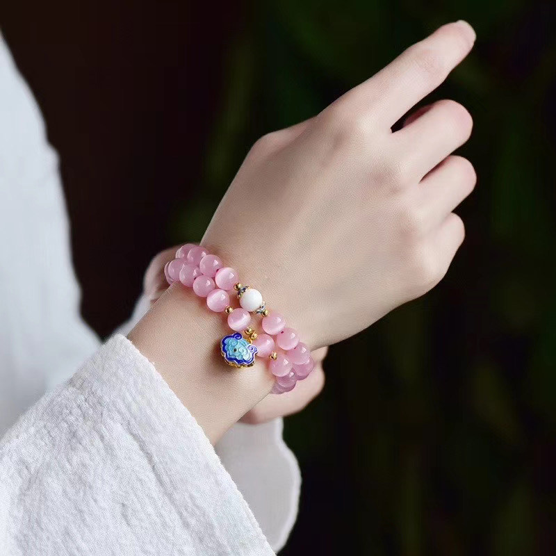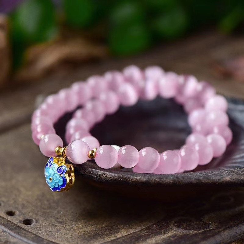 精美百搭天然粉色猫眼石手链 烤蓝色祥云锁手链 粉色水晶手链