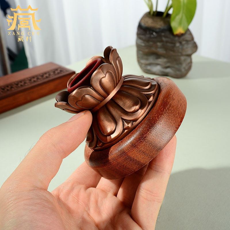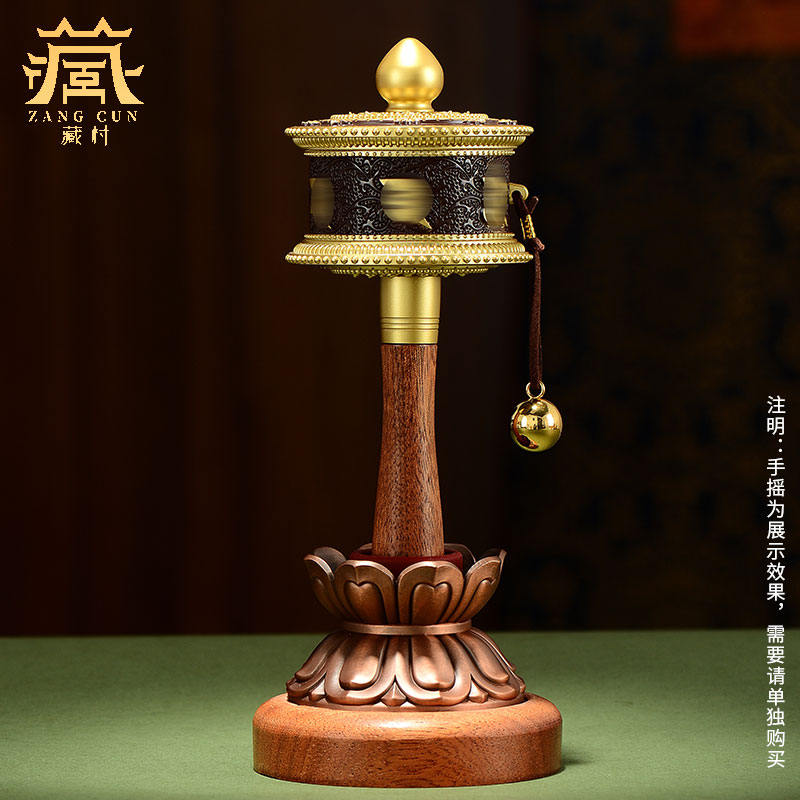 手摇转动轮底座 西藏式实木转金筒莲花财神箭 手持转动筒底座摆件