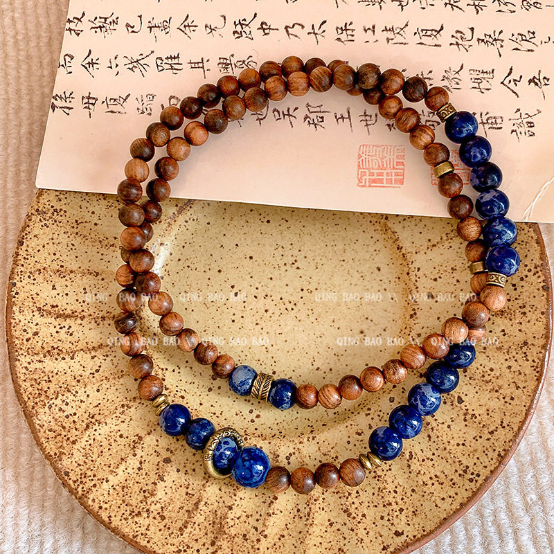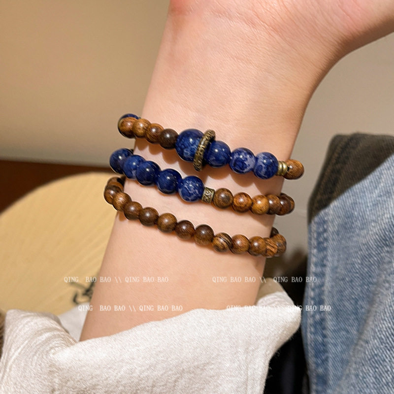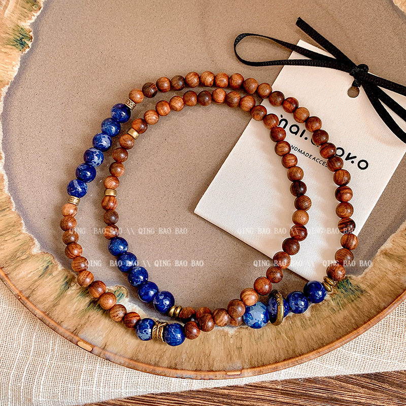 新中式双层叠带木珠手链女民族风复古蓝色水晶手串小众高级感手饰