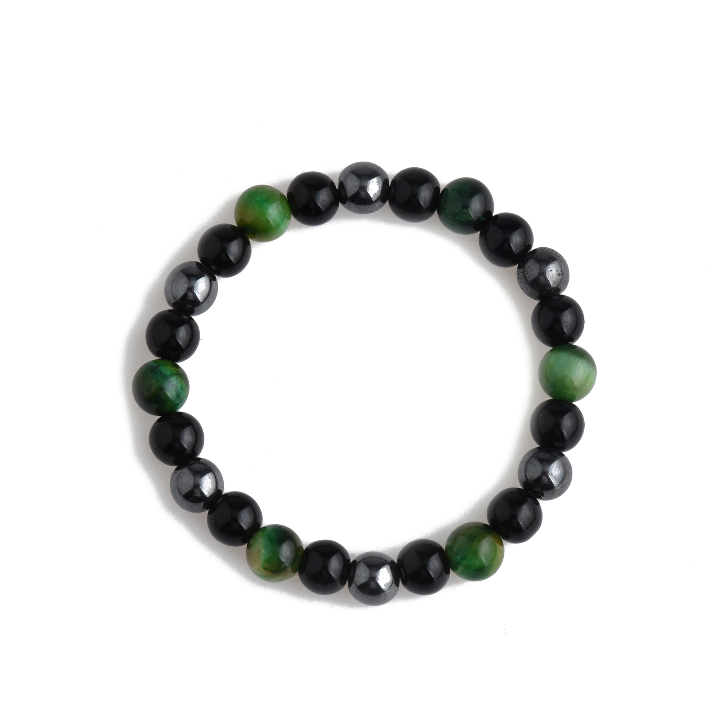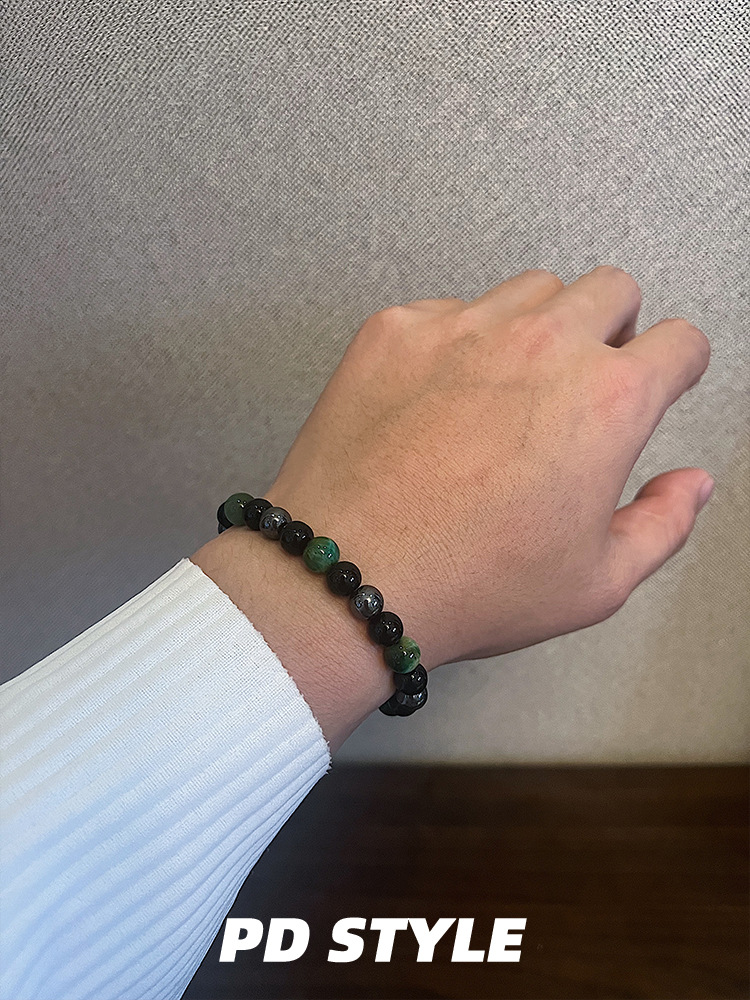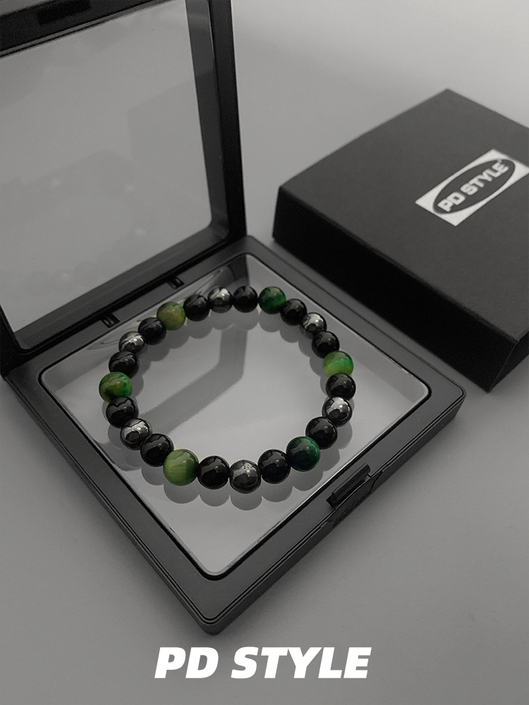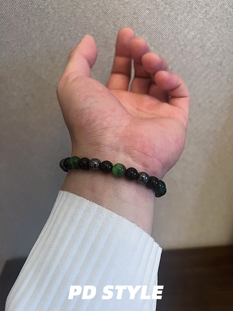 PDSTYLE 绿色虎眼石拼接手串男女生黑胆石弹力绳手链精致情侣配饰