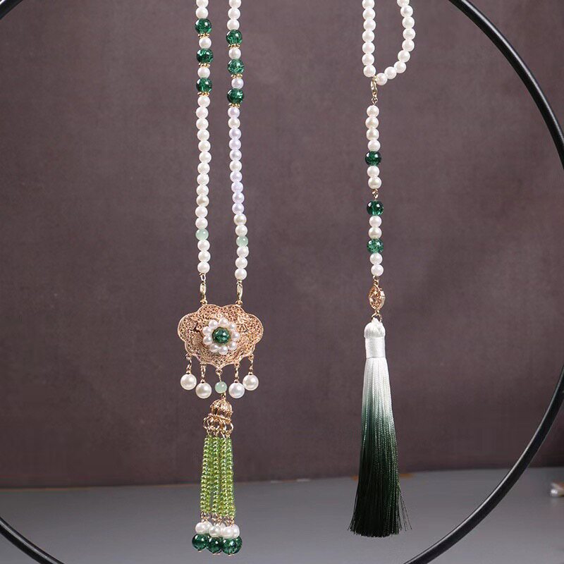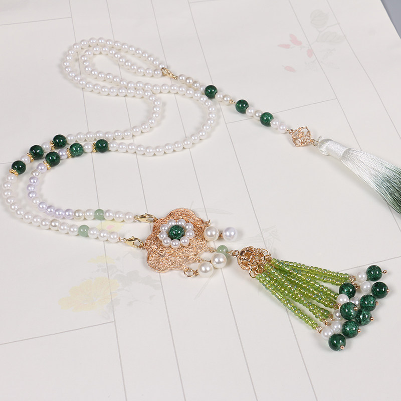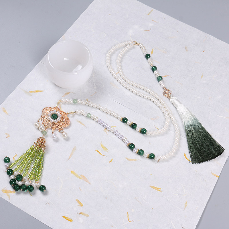 晚明风绿色米珠项链冰丝渐变流苏背云压襟长璎珞汉服旗袍国风配饰