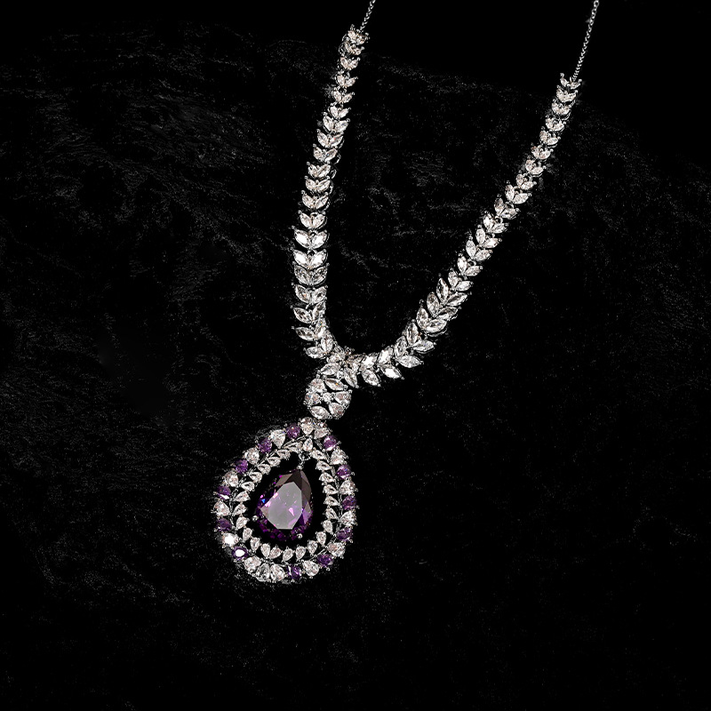 紫色水滴钻石吊坠项链耳环戒子手链四件套网红夸张奢华高级感宴会
