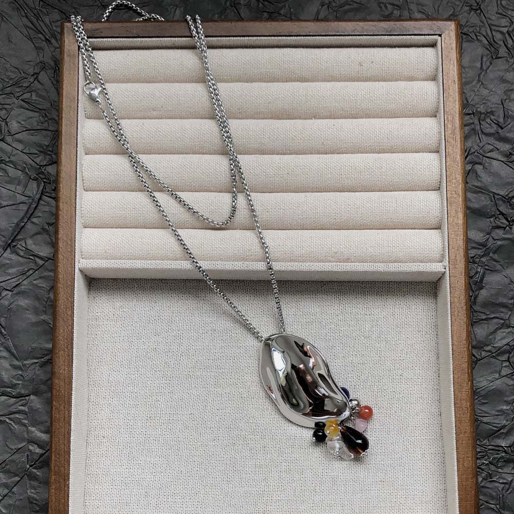冷淡风长款不规则褶皱椭圆天然石串珠吊坠项链女小众金属感毛衣链