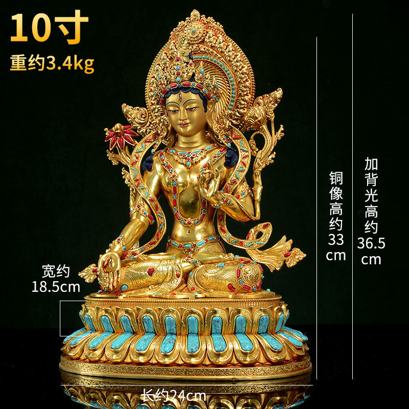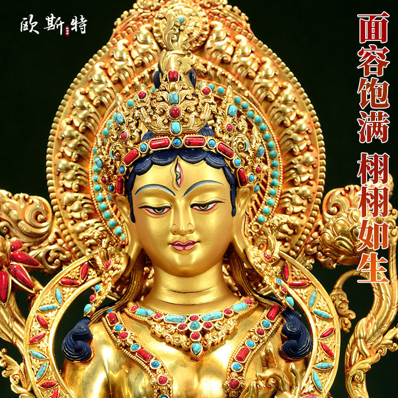 欧斯特彩珠镶嵌《白度母》全鎏金精工《白多罗观音》铜佛像摆件