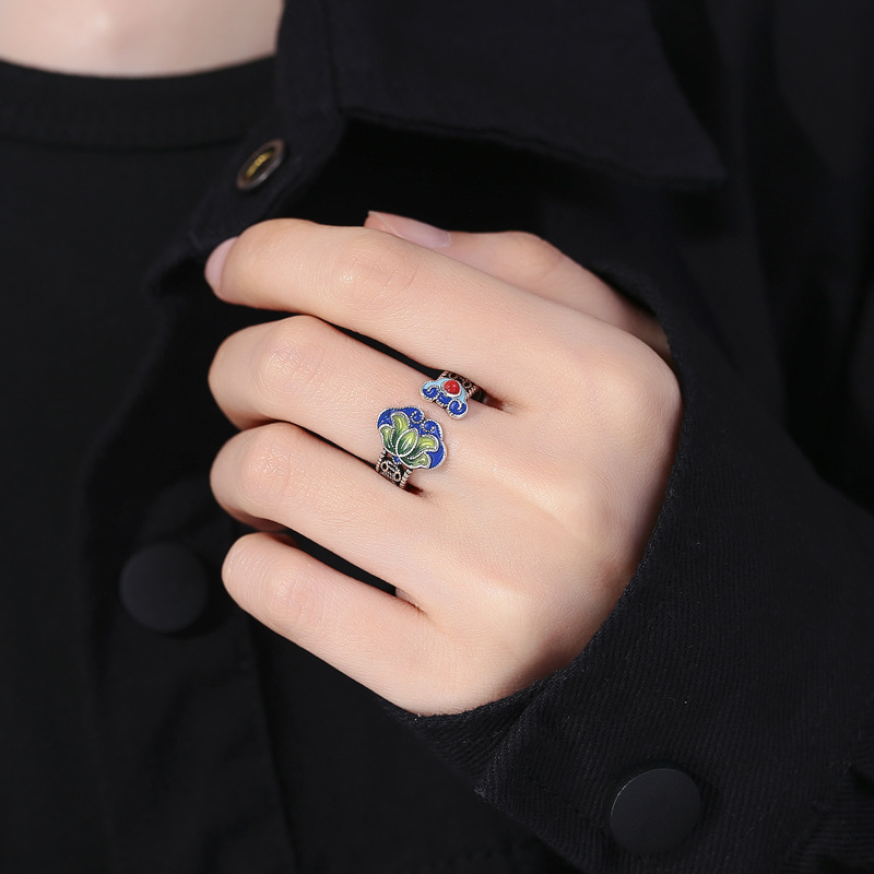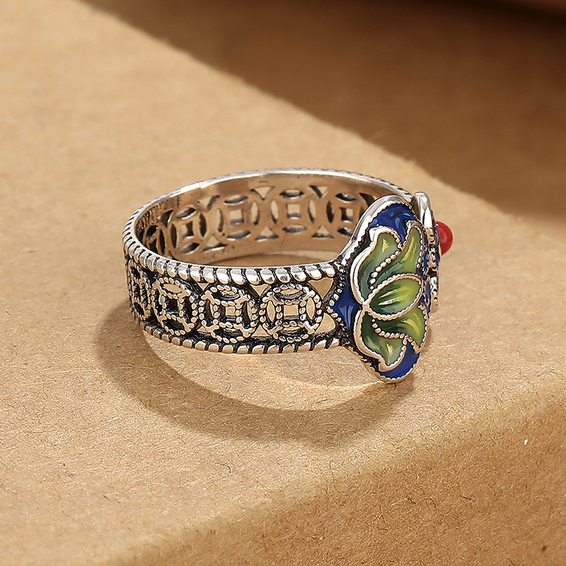 复古银色镂空国潮莲花如意铜钱戒指女民族风滴胶开口可调节手饰品