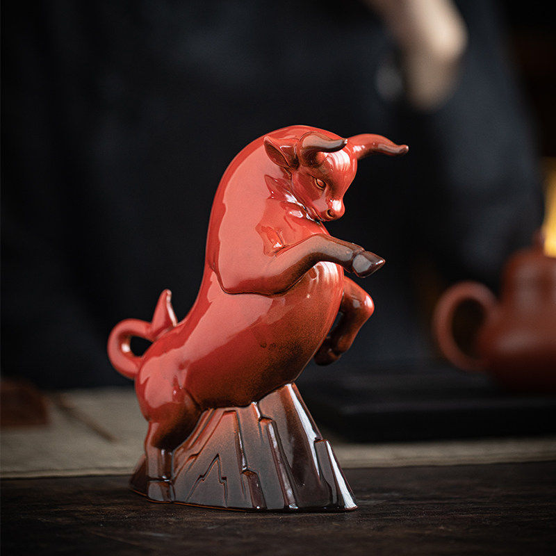 创意红色陶瓷牛摆件客厅桌面装饰品家居风水牛吉祥物工艺品