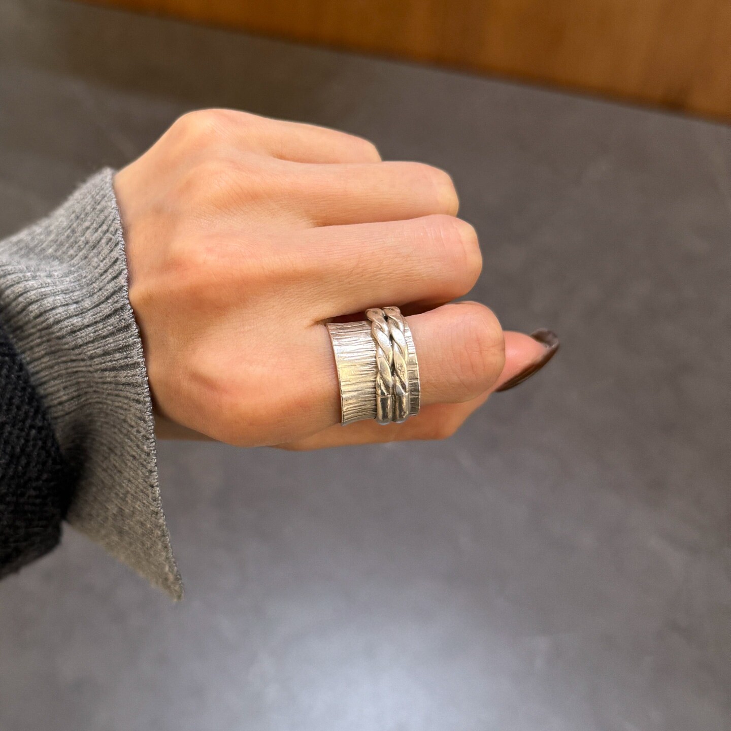 S925纯银双麻花编织宽面素圈戒指女轻奢高级感小众设计食指戒指环