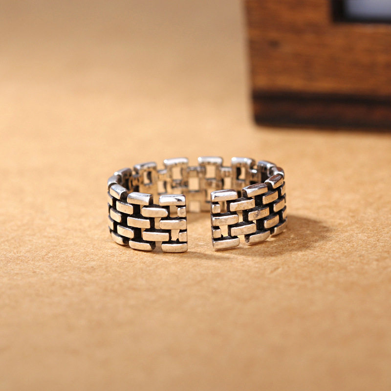 韩版正方形泰银开口戒指指环绳股编纹绞丝复古砖块表链素银戒指女