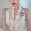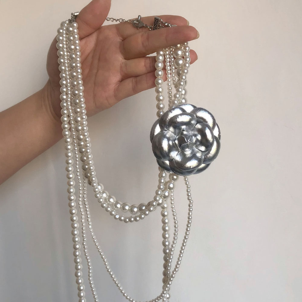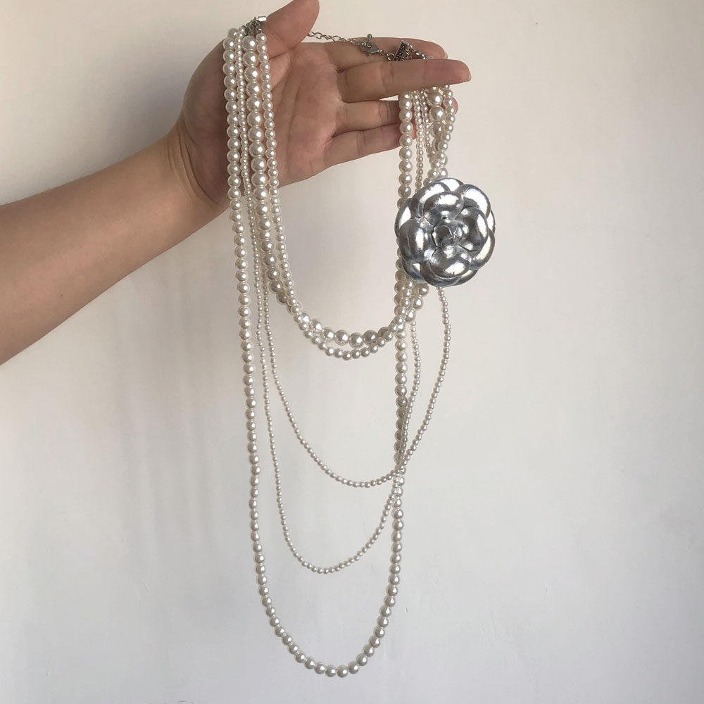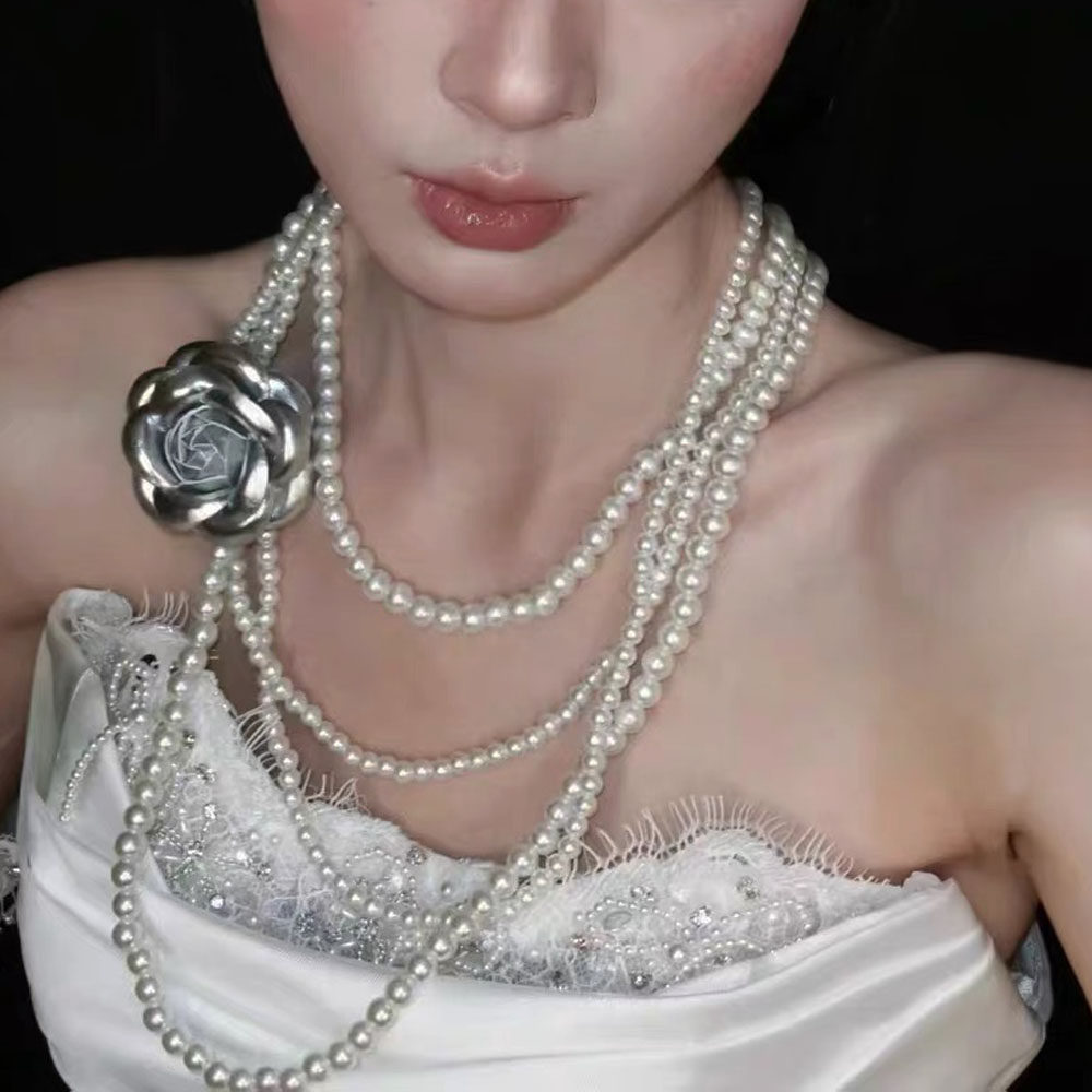 轻奢时髦多层叠戴珍珠串珠项链女时尚优雅气质感灰色山茶花毛衣链