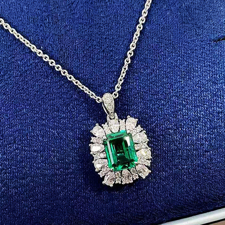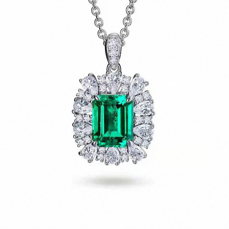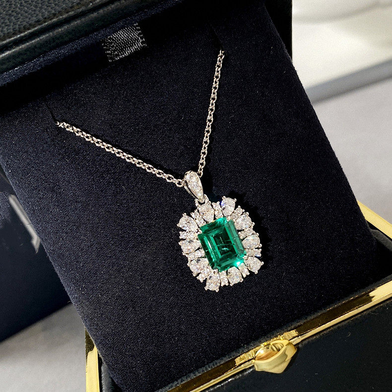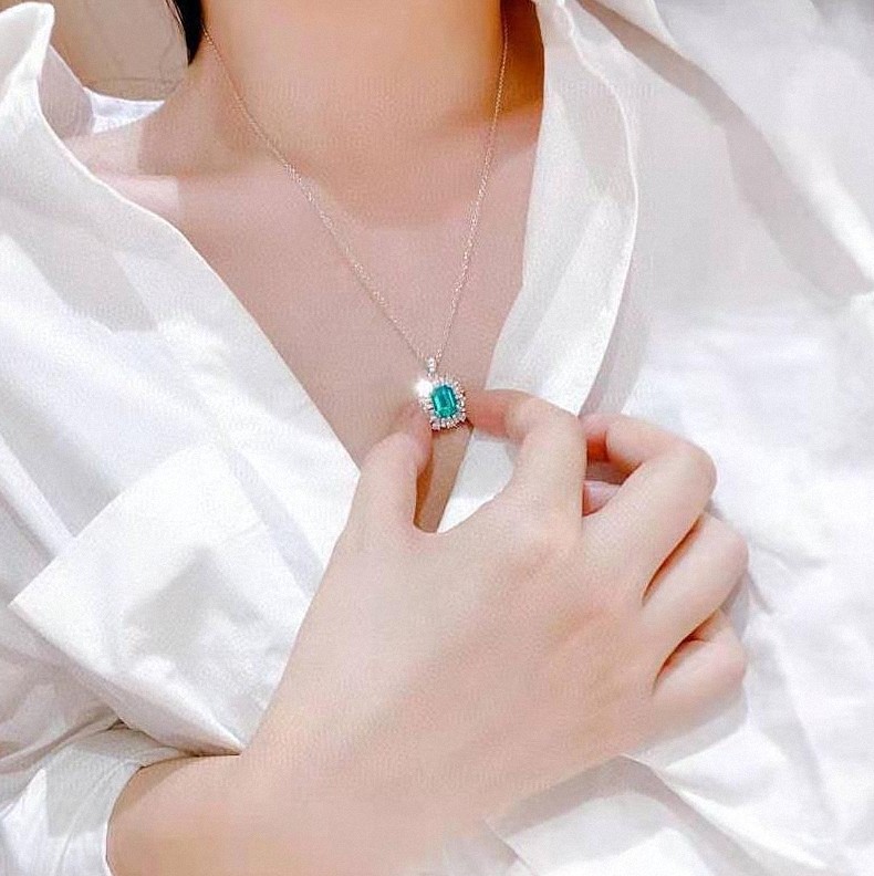 哥伦比亚祖母绿宝石项链女纯银白金推方满钻方形吊坠锁骨链高级潮