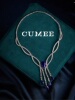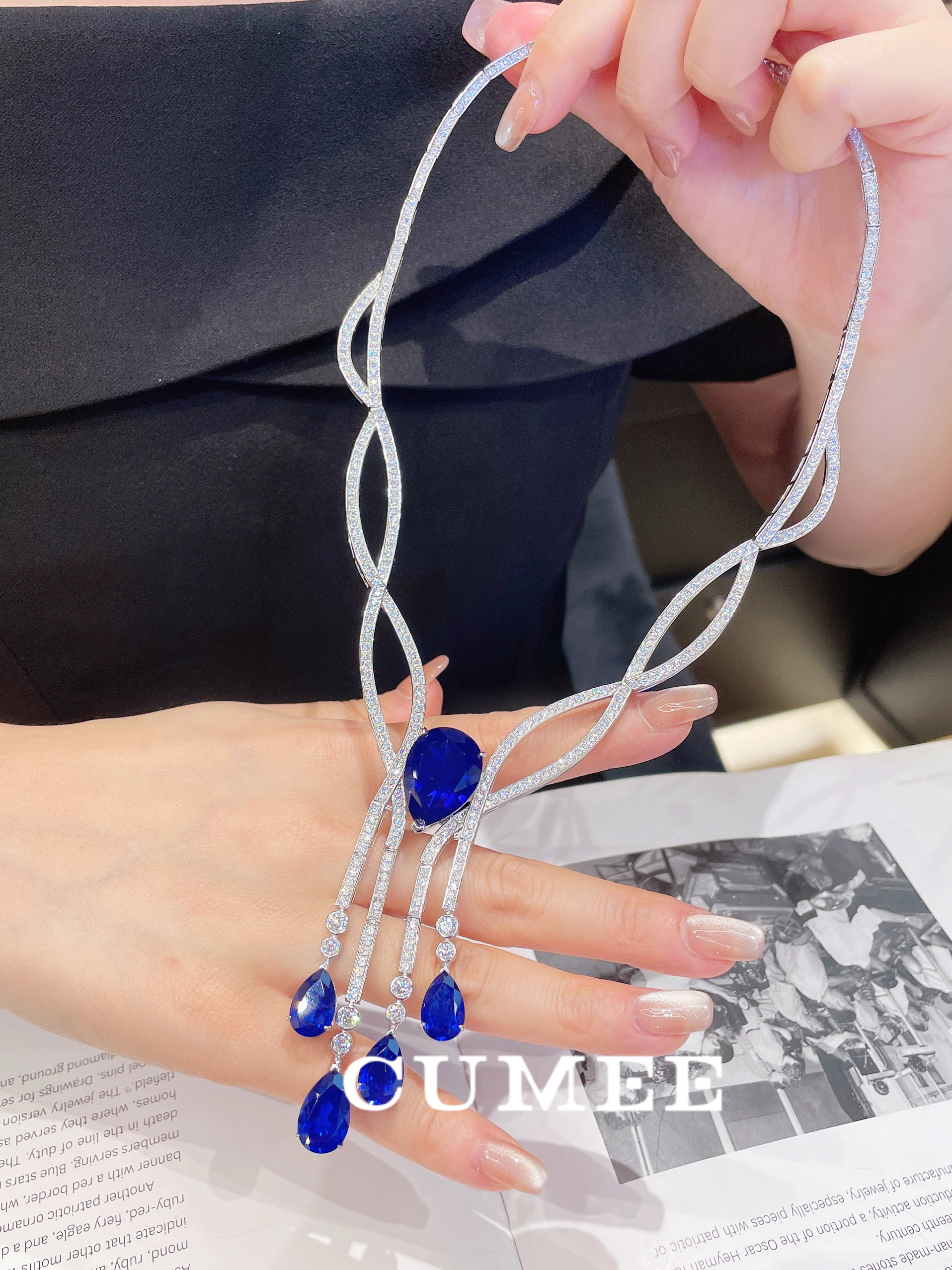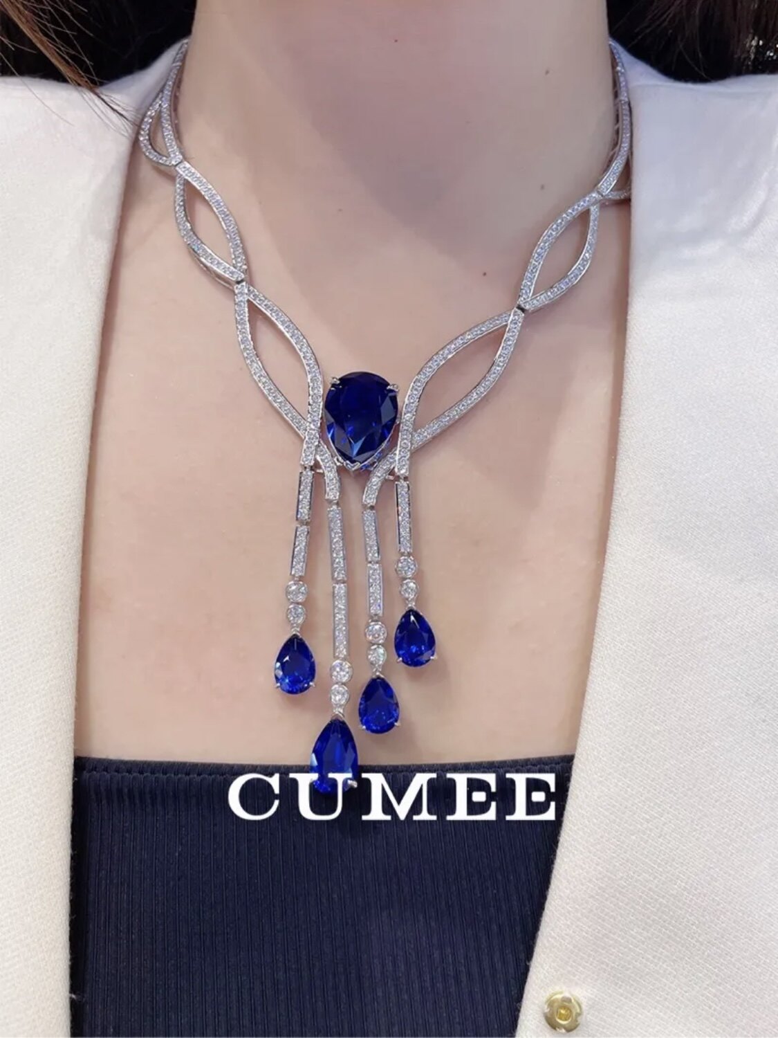 原创设计晚宴款人工合成蓝色宝石高级项链.银镀金