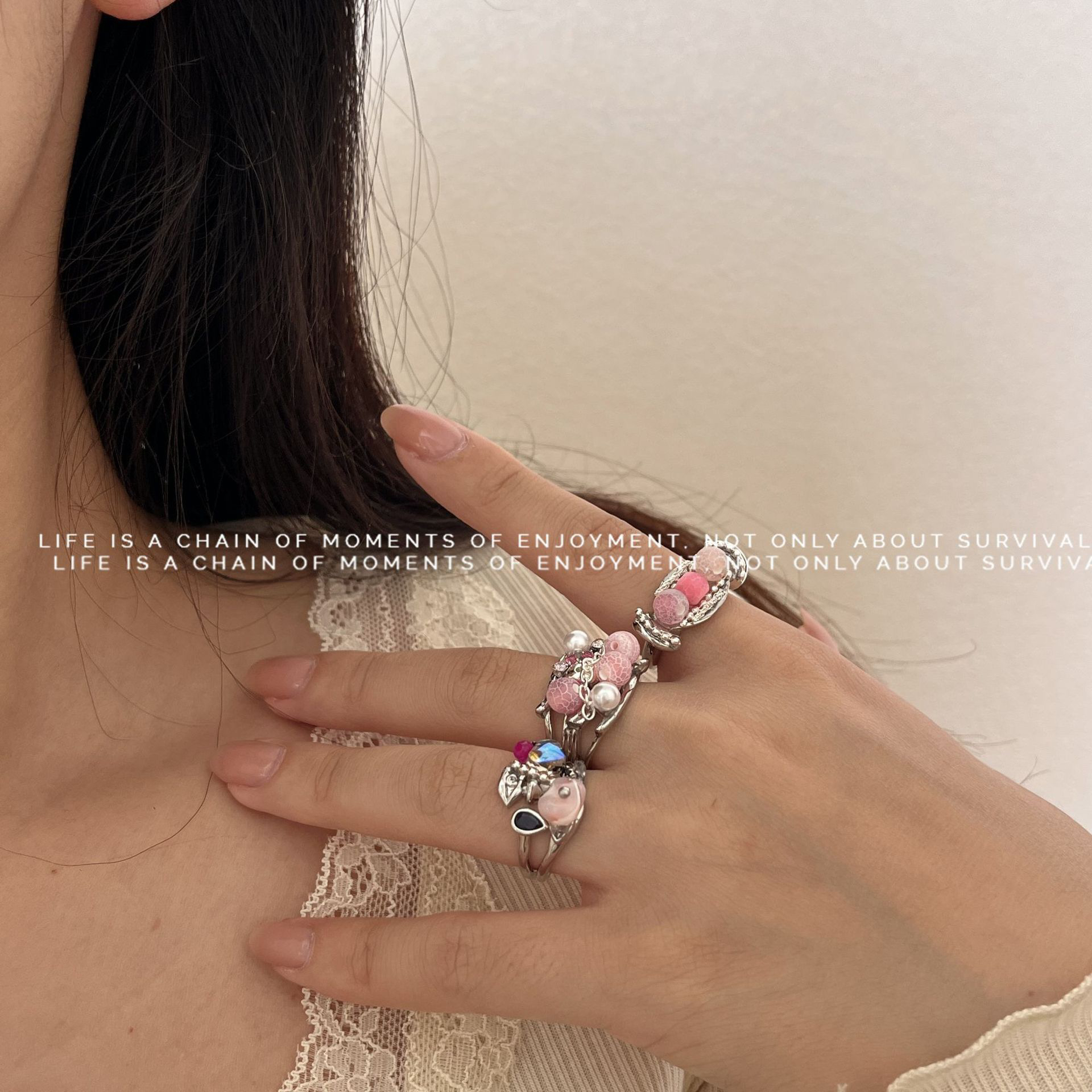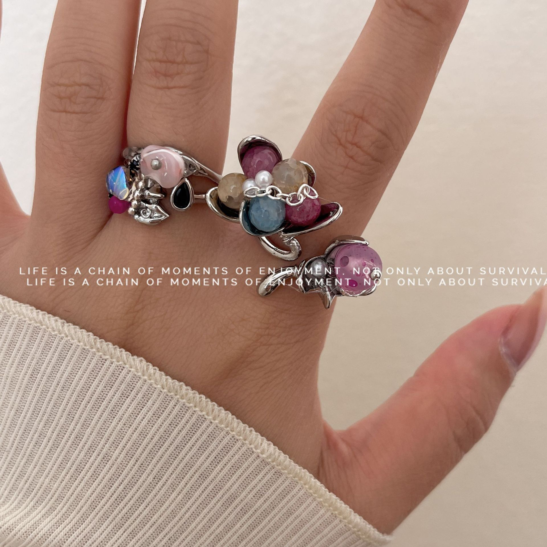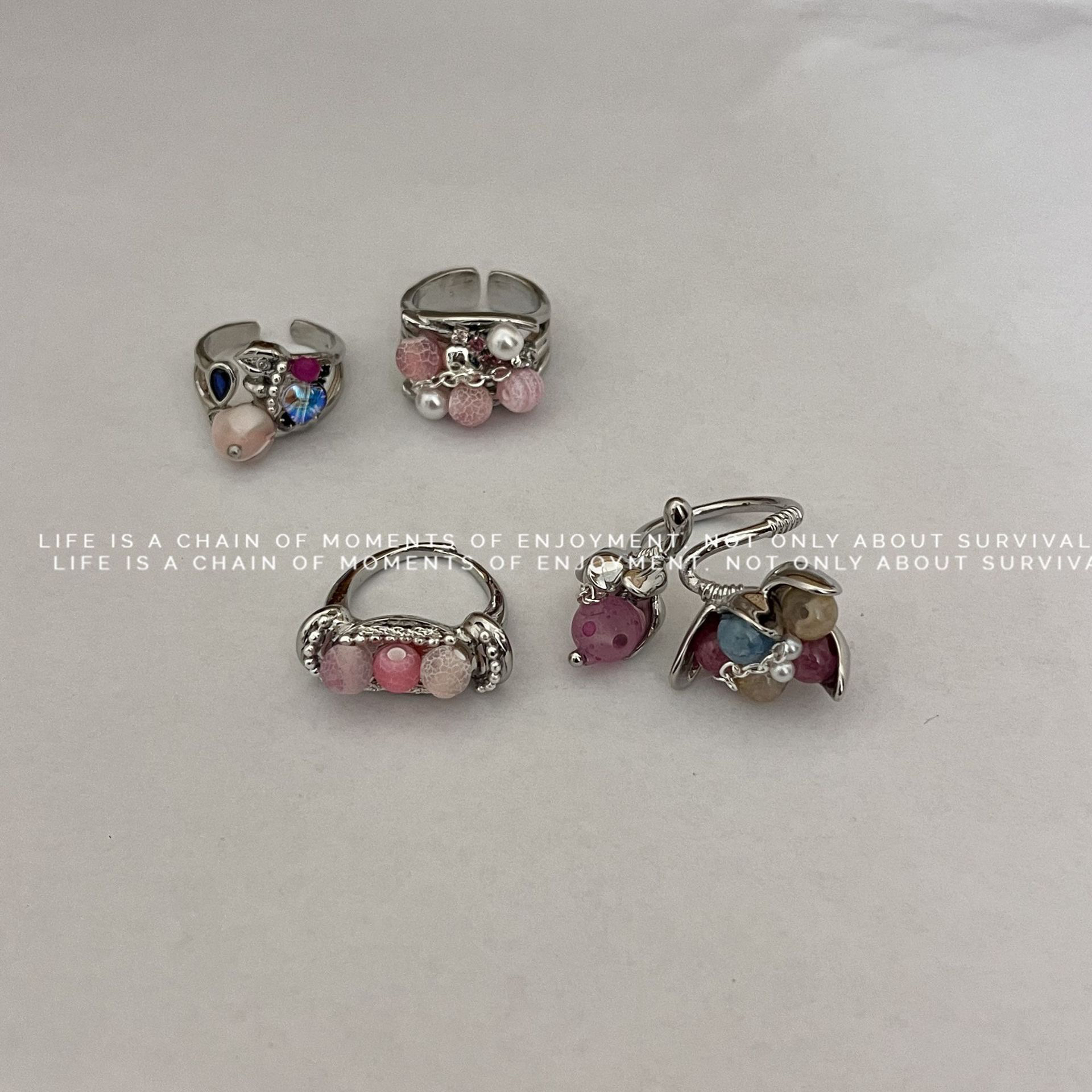 新中式国风异形花朵戒指小众设计金属宽版彩色天然石串珠手工指环
