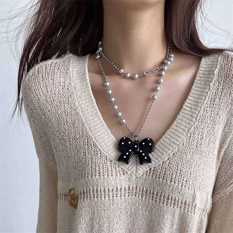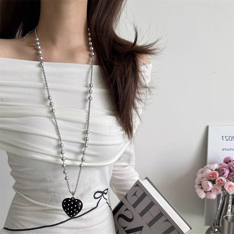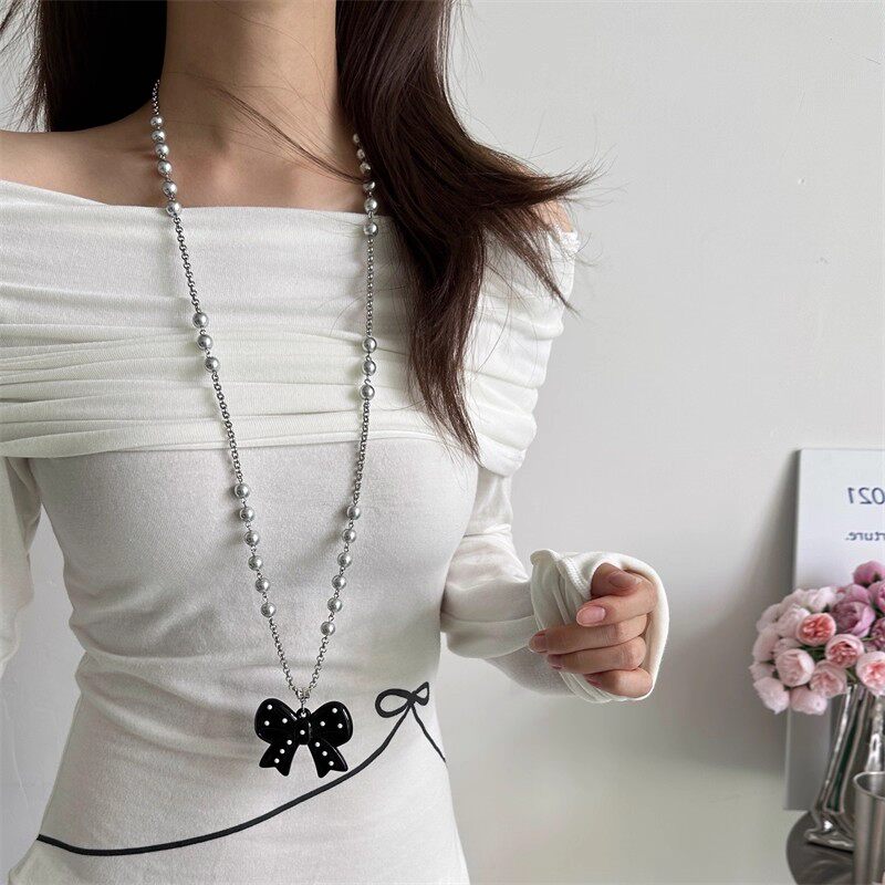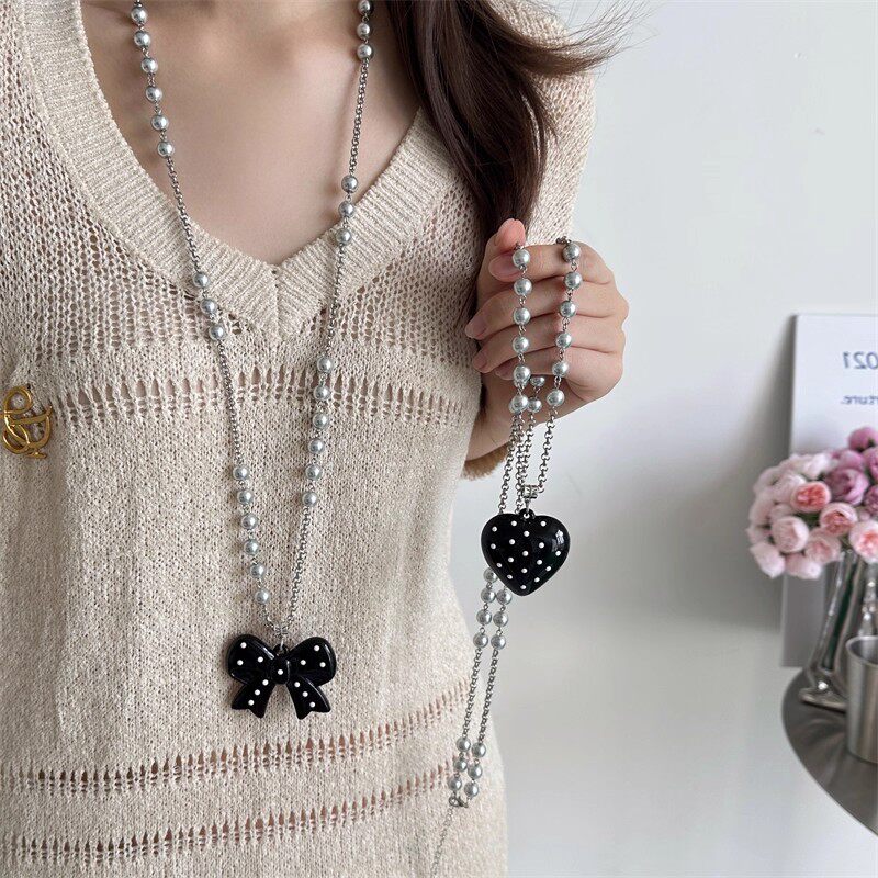 日韩风长款灰色珍珠桃心蝴蝶结吊坠项链女ins风个性百搭毛衣链潮
