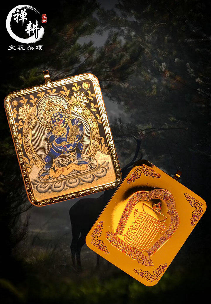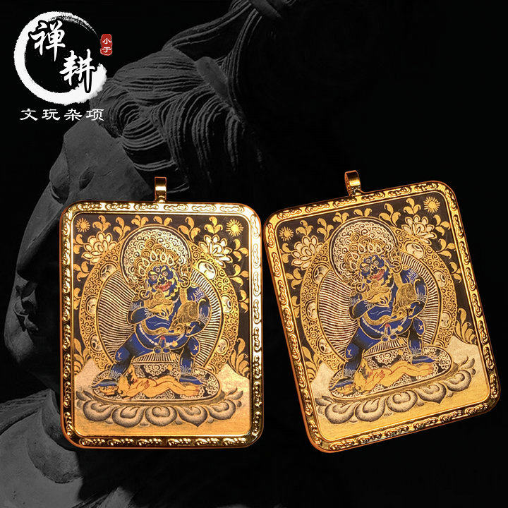 手绘小唐卡黑财随身扎卡镀金外壳热贡微唐黑金吊坠矿料布本彩唐