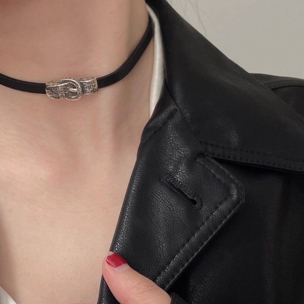 日韩新款黑色皮质皮带扣项链女小众设计感颈圈颈链个性百搭锁骨链