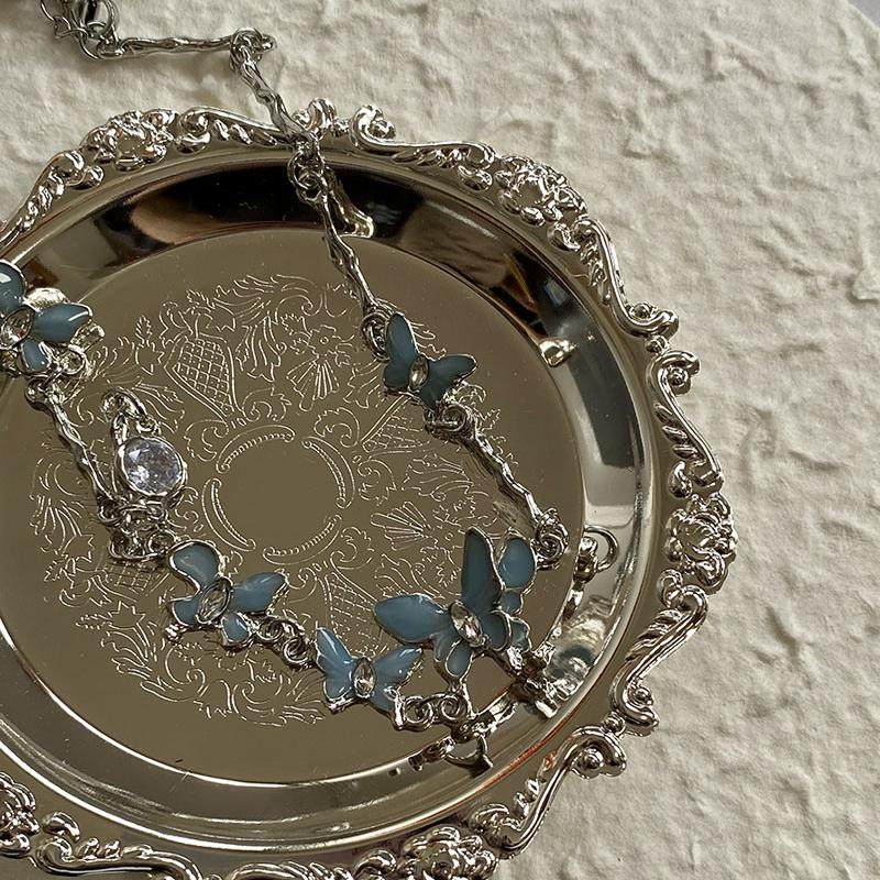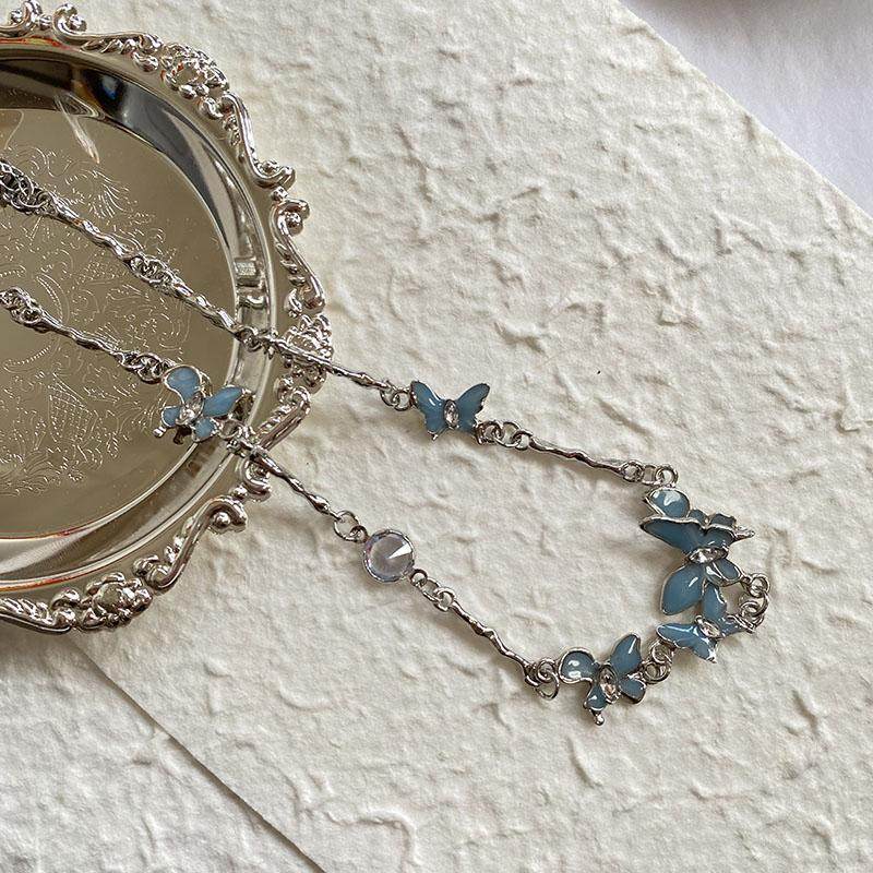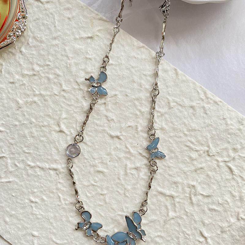 甜酷蓝绿色炫彩水晶蝴蝶少女锁骨链简约钛钢复古项链