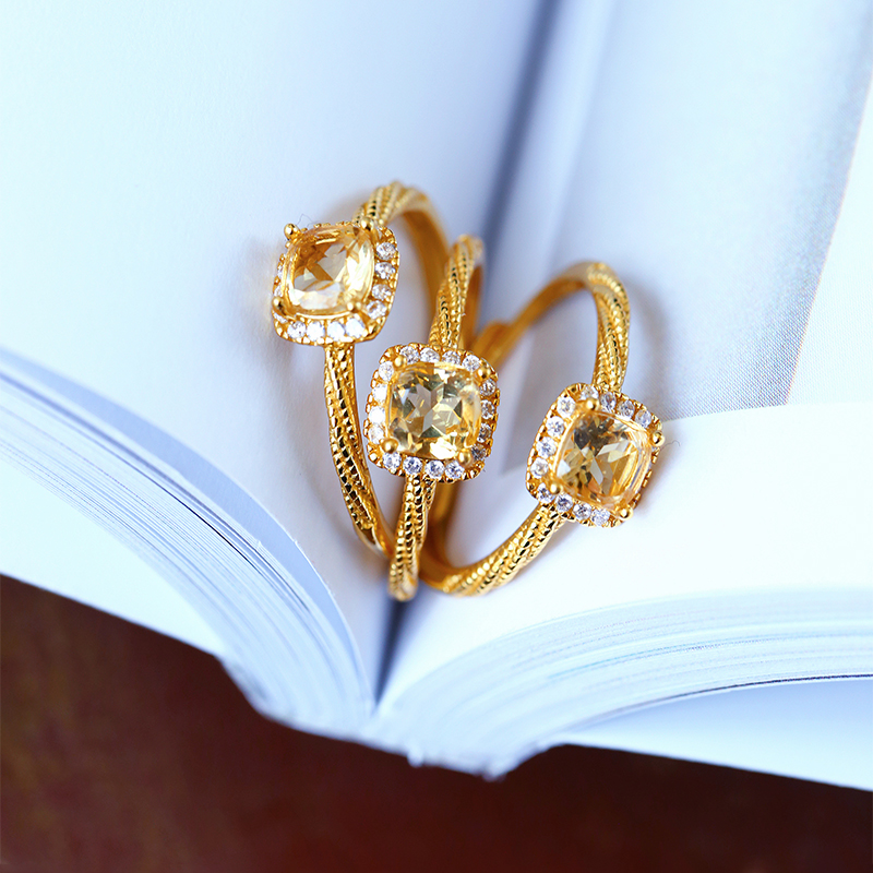 天然巴西黄水晶方糖戒指女款 活口可调节 刻面925纯银古法金镶嵌