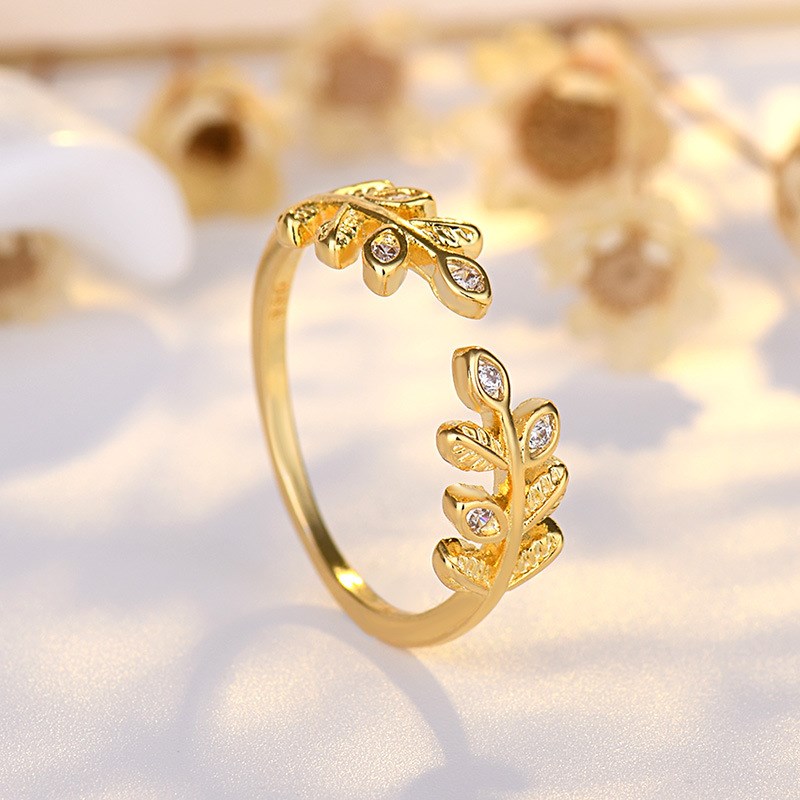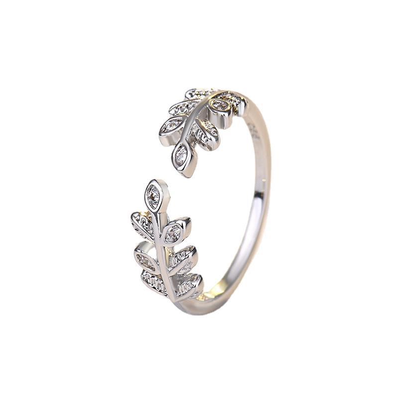 镀纯银小清新镶钻树叶树枝开口女戒时尚气质冷淡风简约可调节戒指