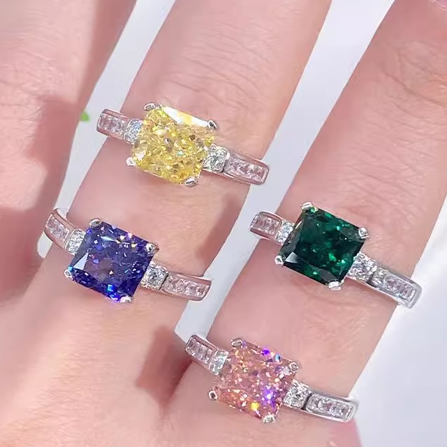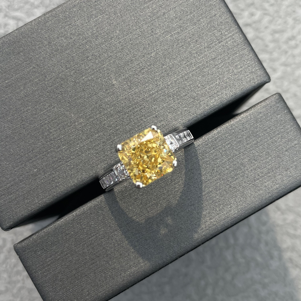 冰花切2克拉培育高碳钻纯银925戒指镶嵌小方糖黄钻时尚轻奢钻戒女
