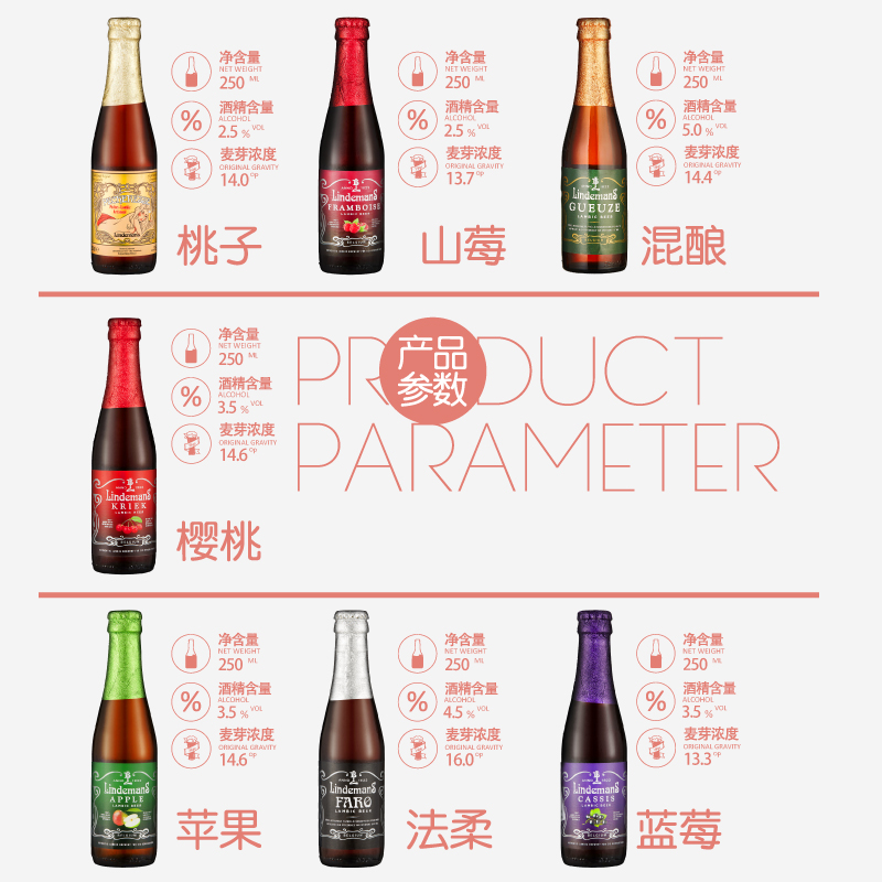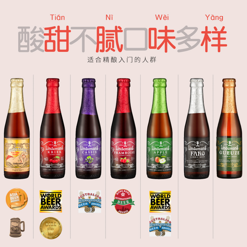 比利时进口林德曼果味精酿啤酒桃子樱桃蓝莓山莓多口味组合6瓶装