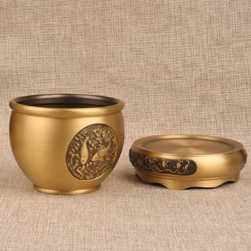 年年有余铜缸黄铜水缸客厅摆件纯铜莲花底座中式家居复古雕刻鱼缸