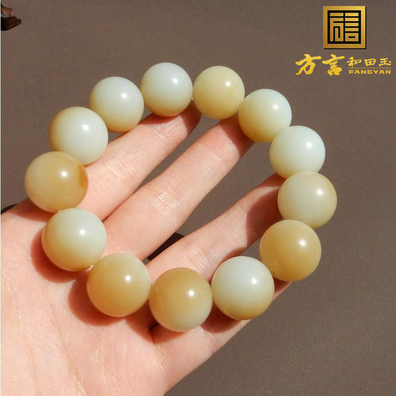 罕见方言和田玉俄罗斯老坑料羊脂白玉带糖14mm圆珠双色豪华手串A2