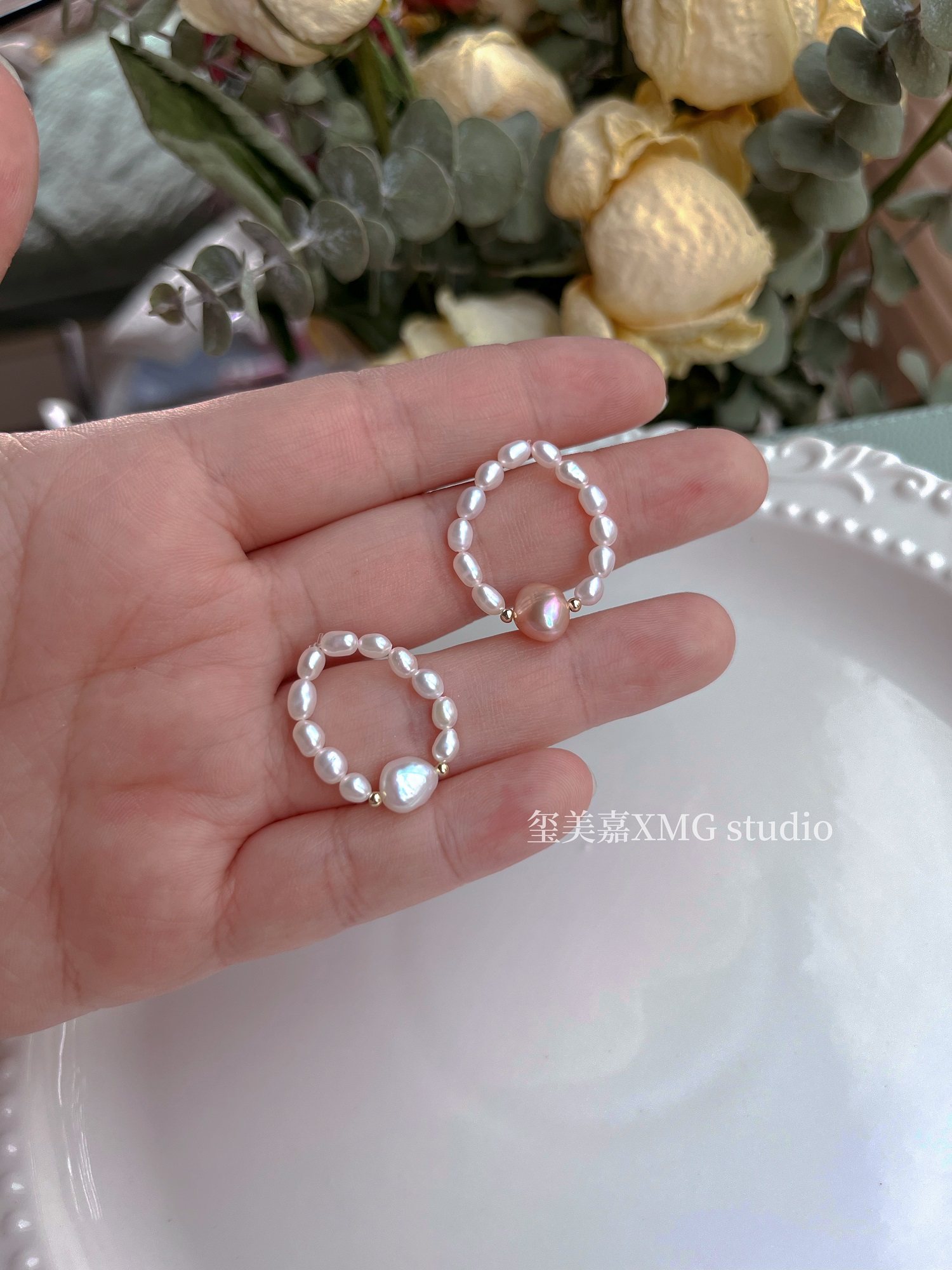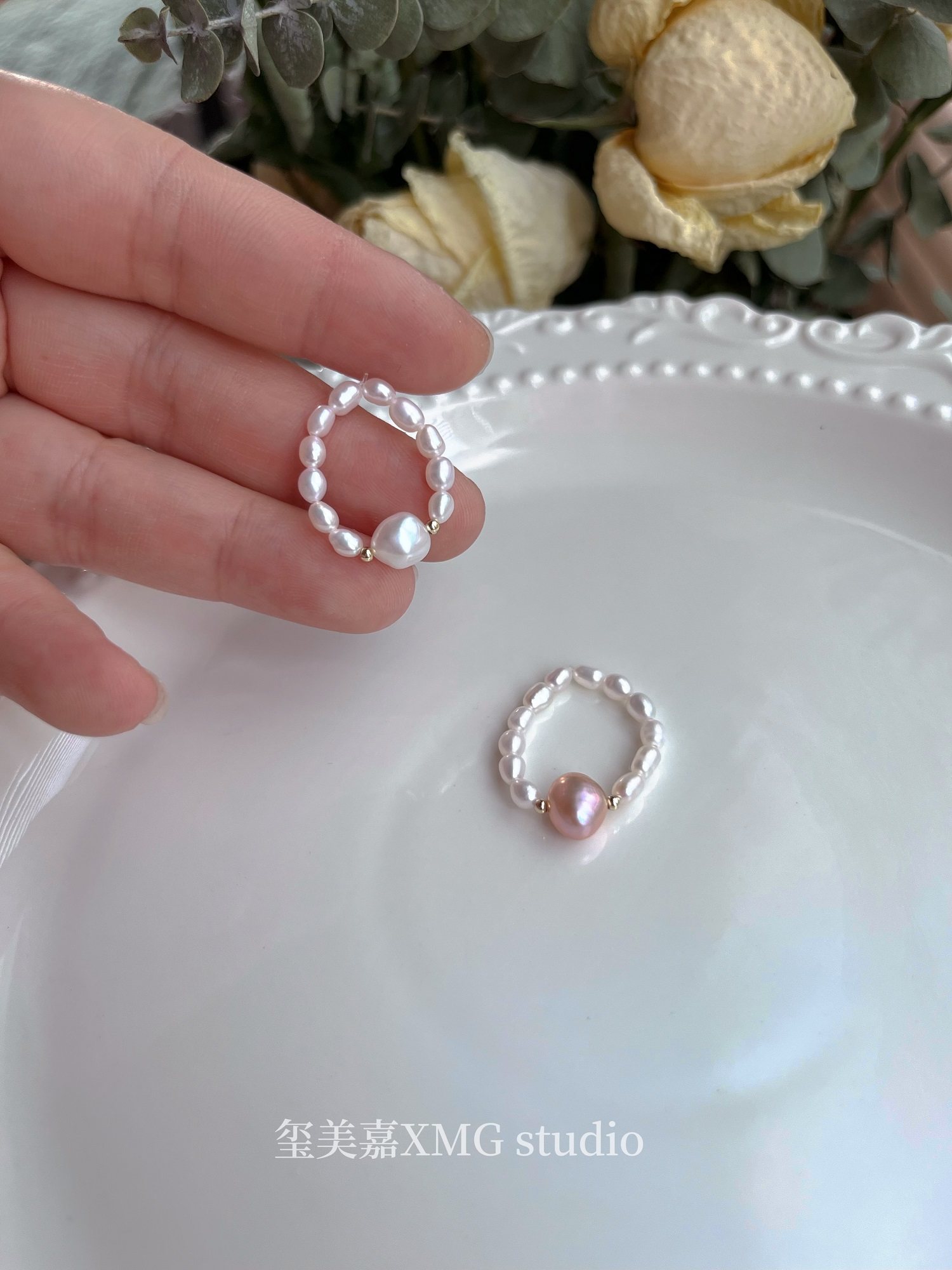 天然淡水真珍珠指环戒圈小珠弹力绳女款ins小众高级感强光叠戴金