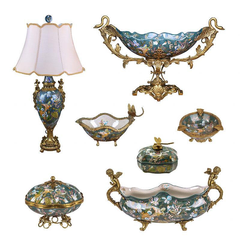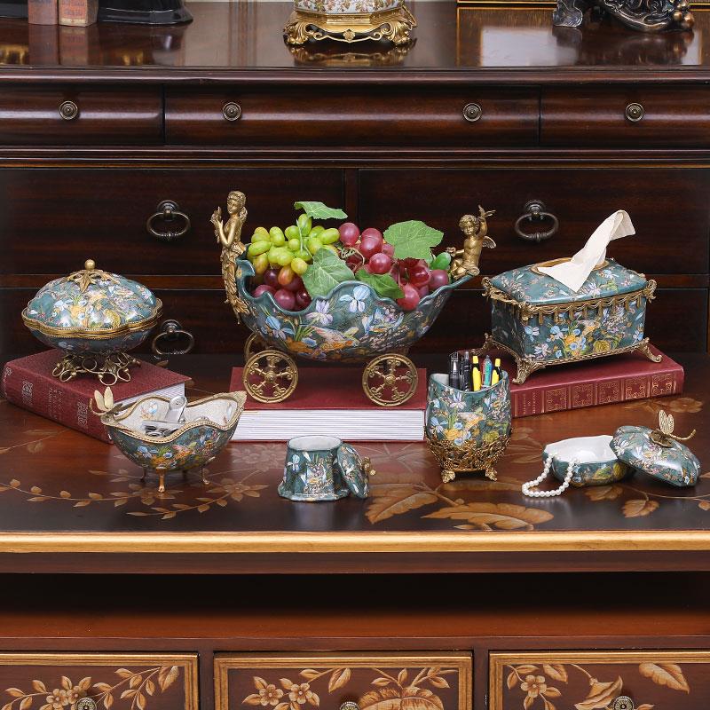 欧式陶瓷配铜花瓶纸巾盒烟灰缸水果盘创意客厅茶几套装装饰品摆件