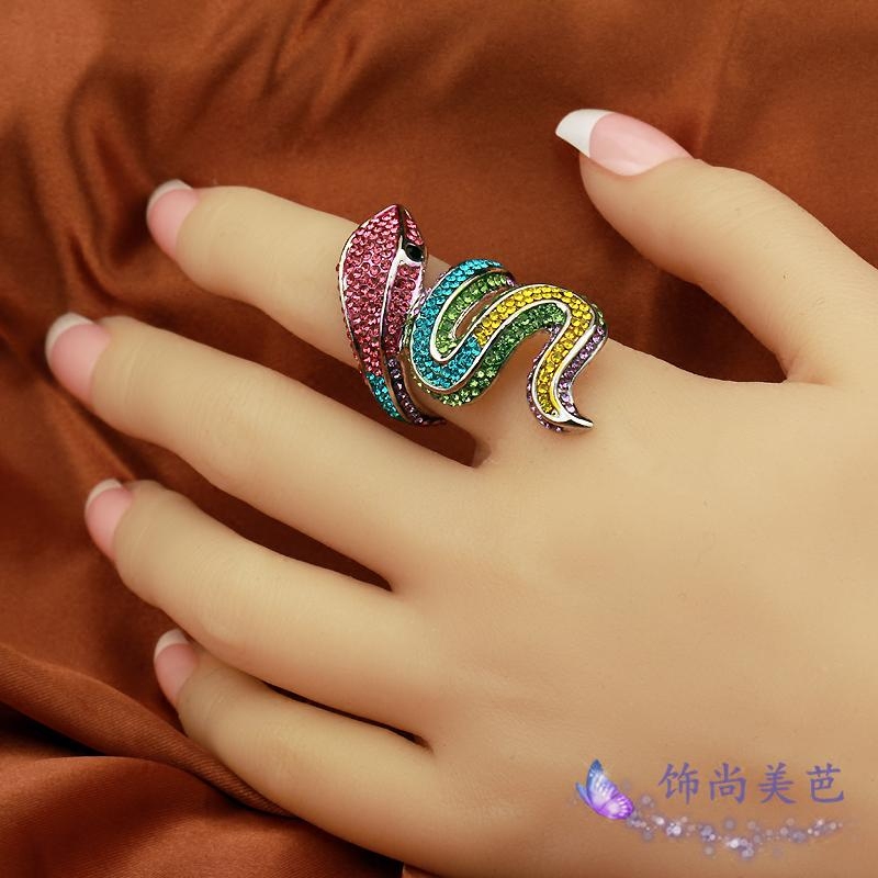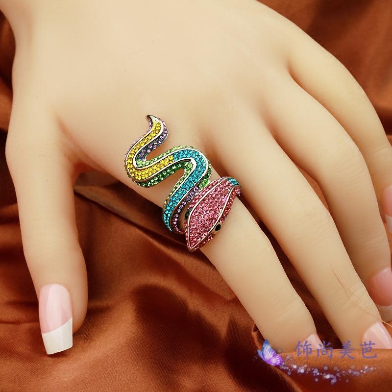 韩版新品个性食指夜店潮人尾戒奢华蛇形彩色满钻夸张指环大戒指女