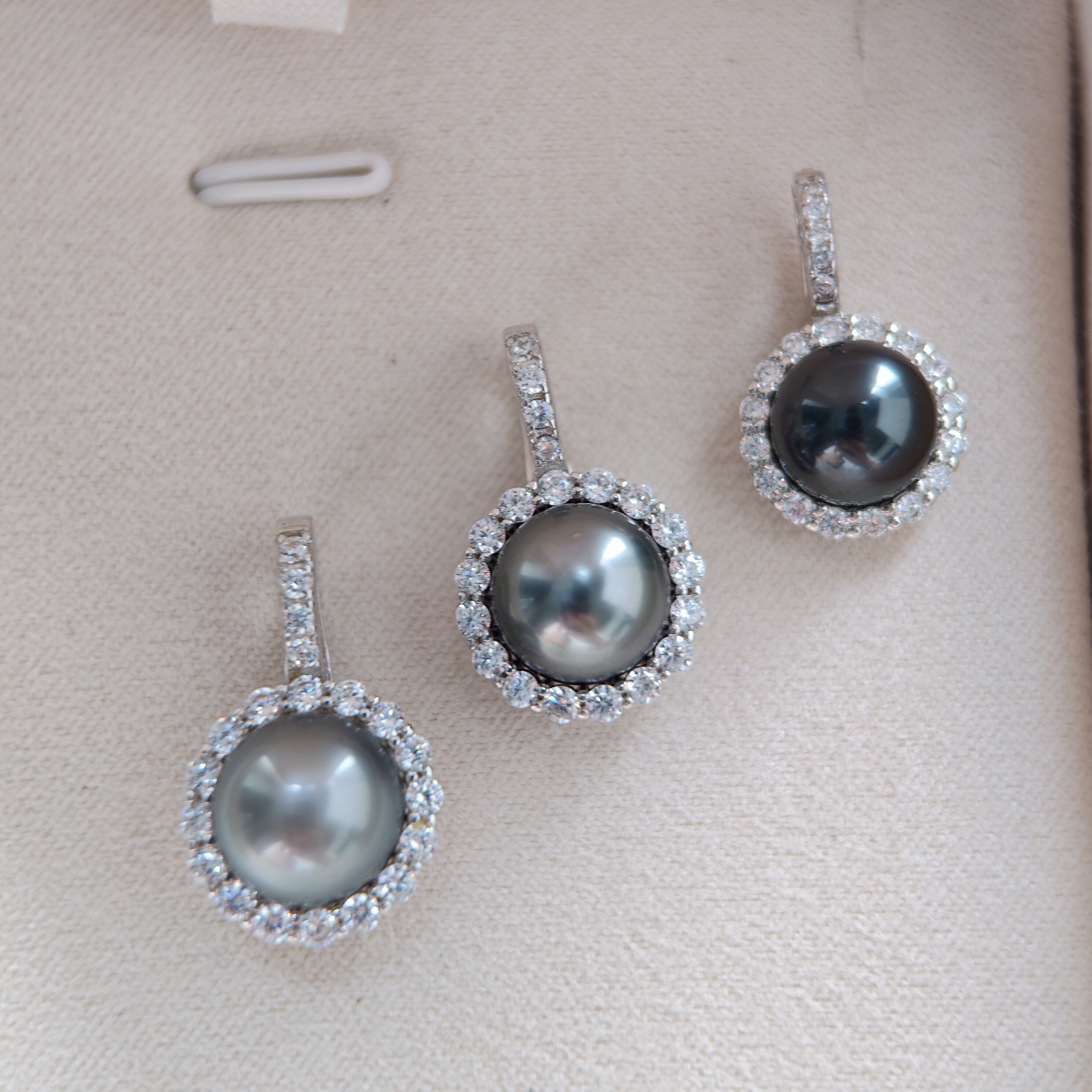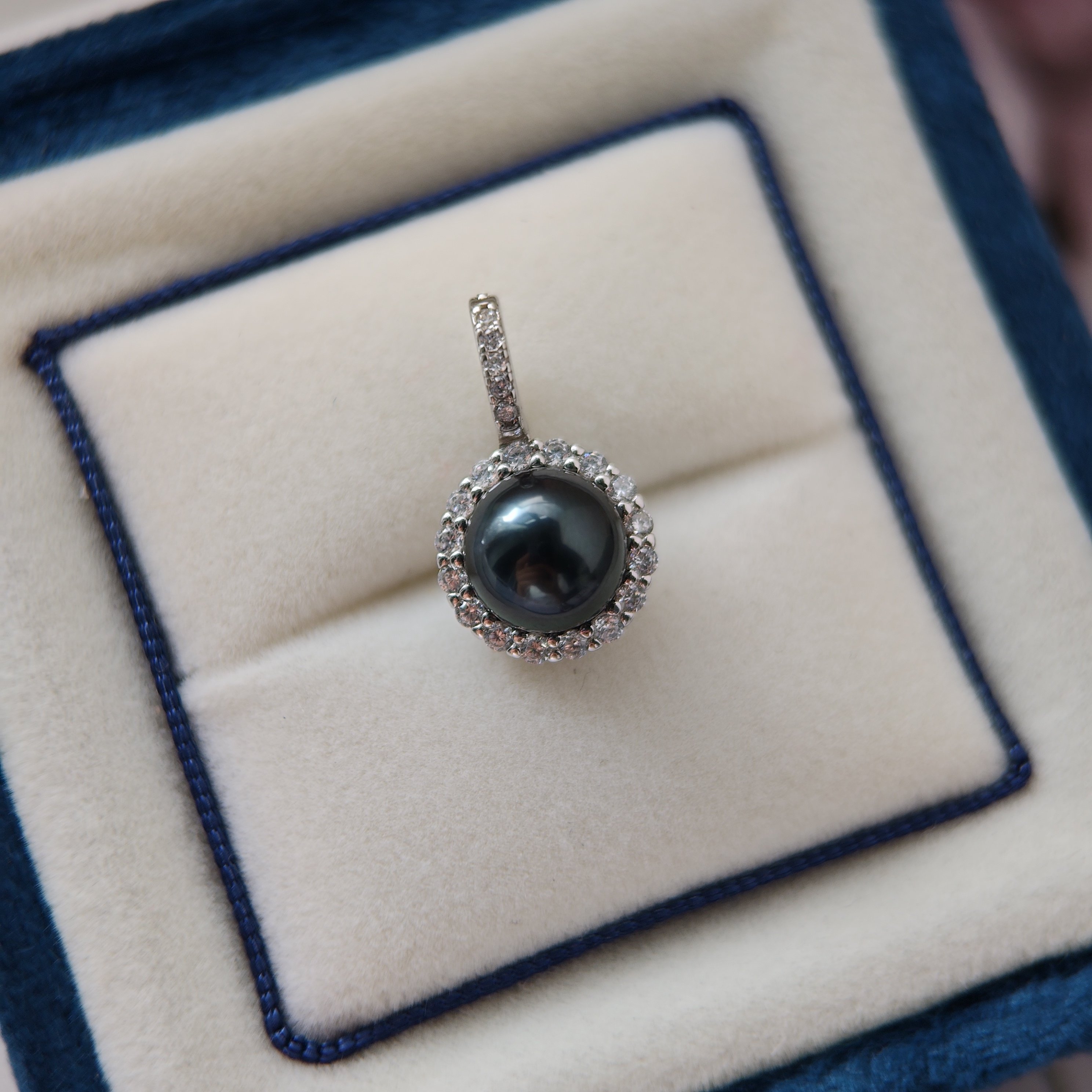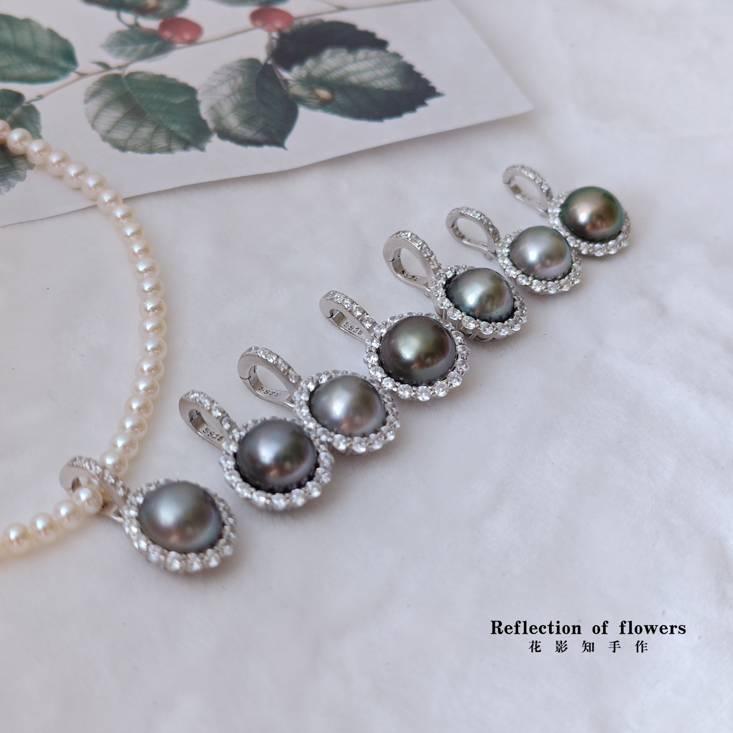 海水大溪地黑珍珠铂金灰孔雀绿吊坠S925银项链太阳花万能扣吊坠