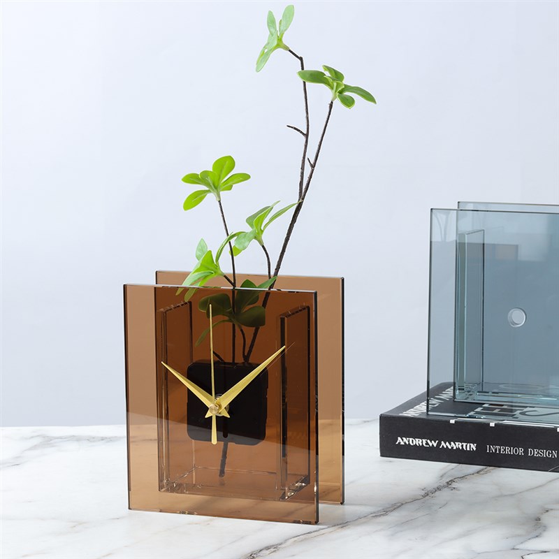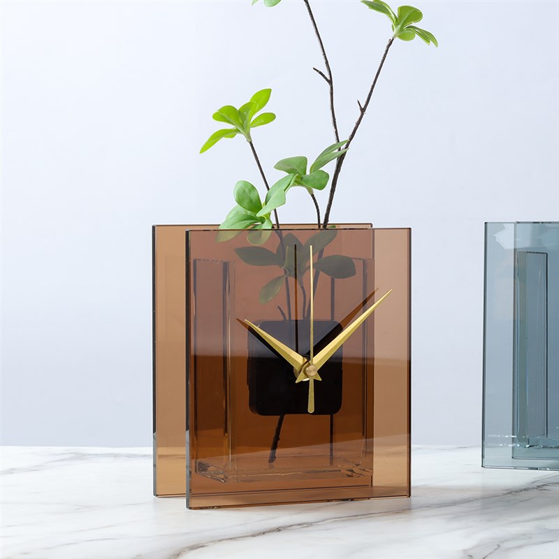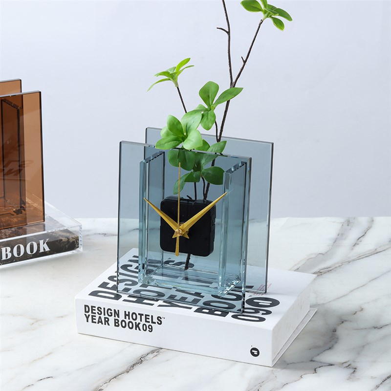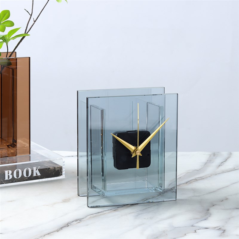 现代简约玻璃茶色蓝色透明方x形时钟座钟桌面摆件样板间软装饰品